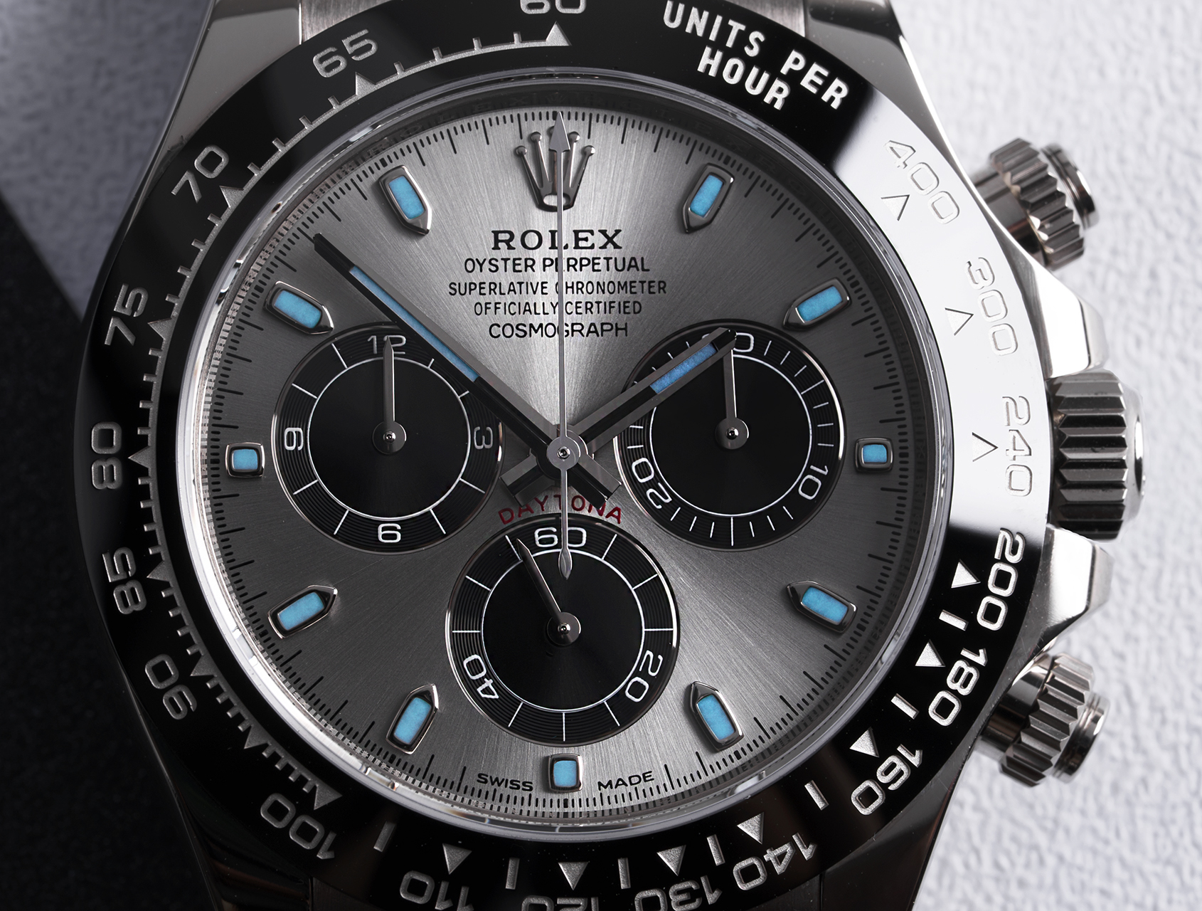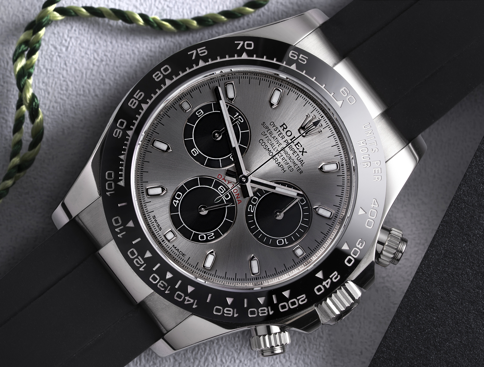 Powered by the Rolex self-winding calibre 4130 (with 70-hr power reserve), waterproof to 100m and fitted to the super versatile Oysterflex strap, secured by its white gold deployant clasp with 5mm Easylink adjustment.