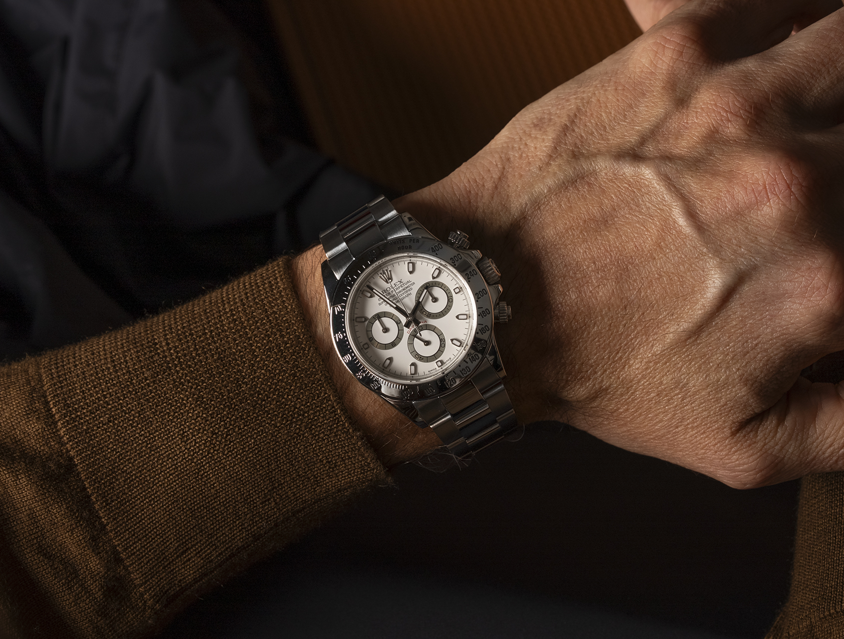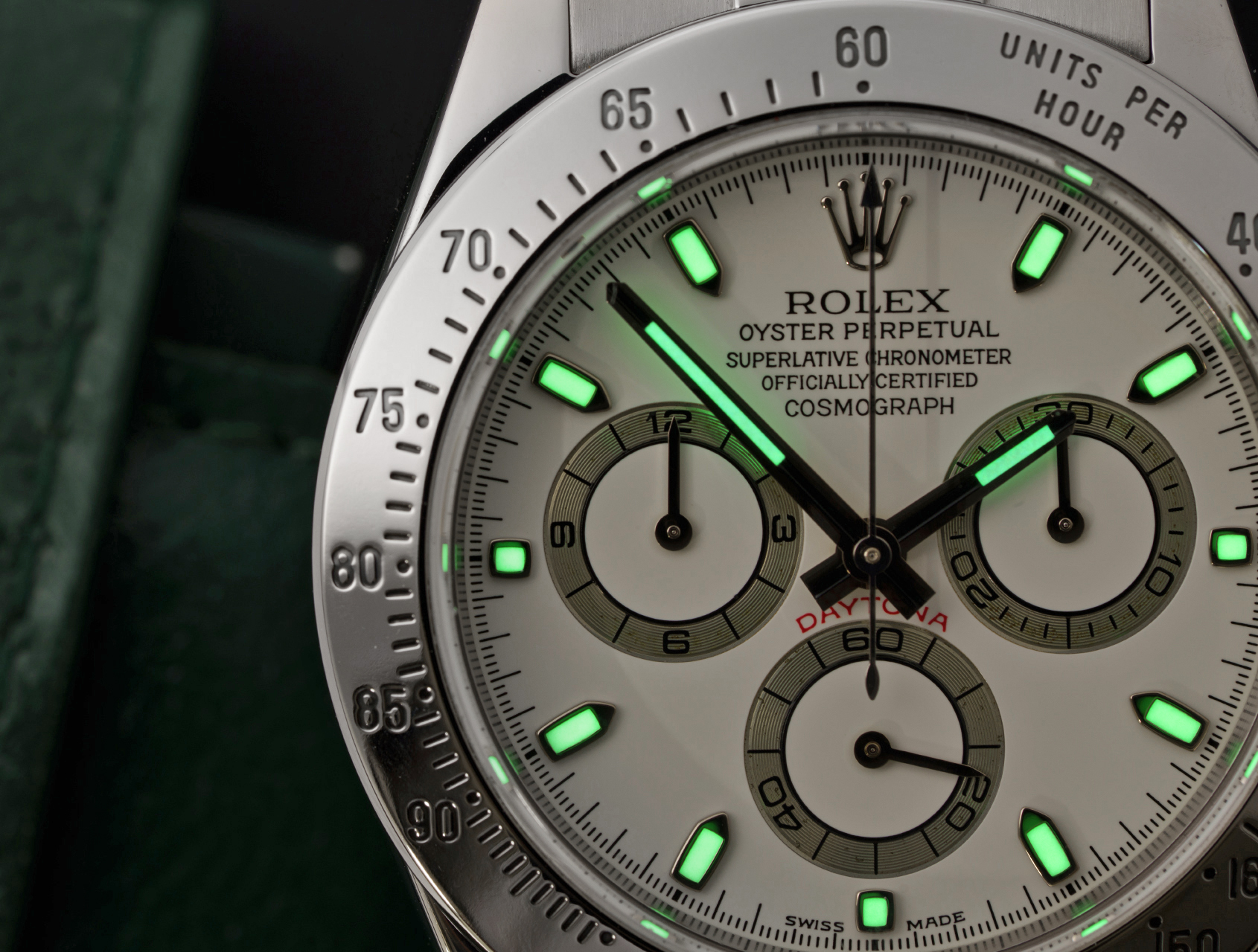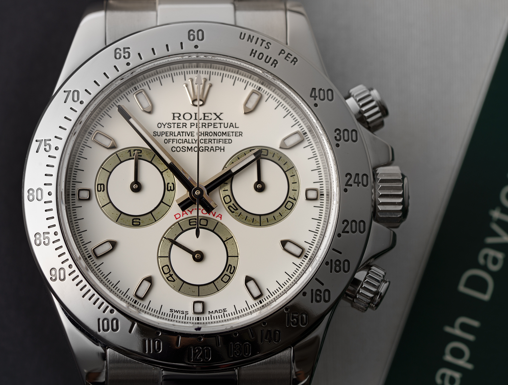 Exclusive to the first years of production (2000-2003) of this reference, a few of these white dial Daytonas develop a creamy patina, earning them their Panna nickname. Our example although not quite a full Panna yet, is showing distinct signs that in years to come it will go on to develop more of this extremely desirable tone.