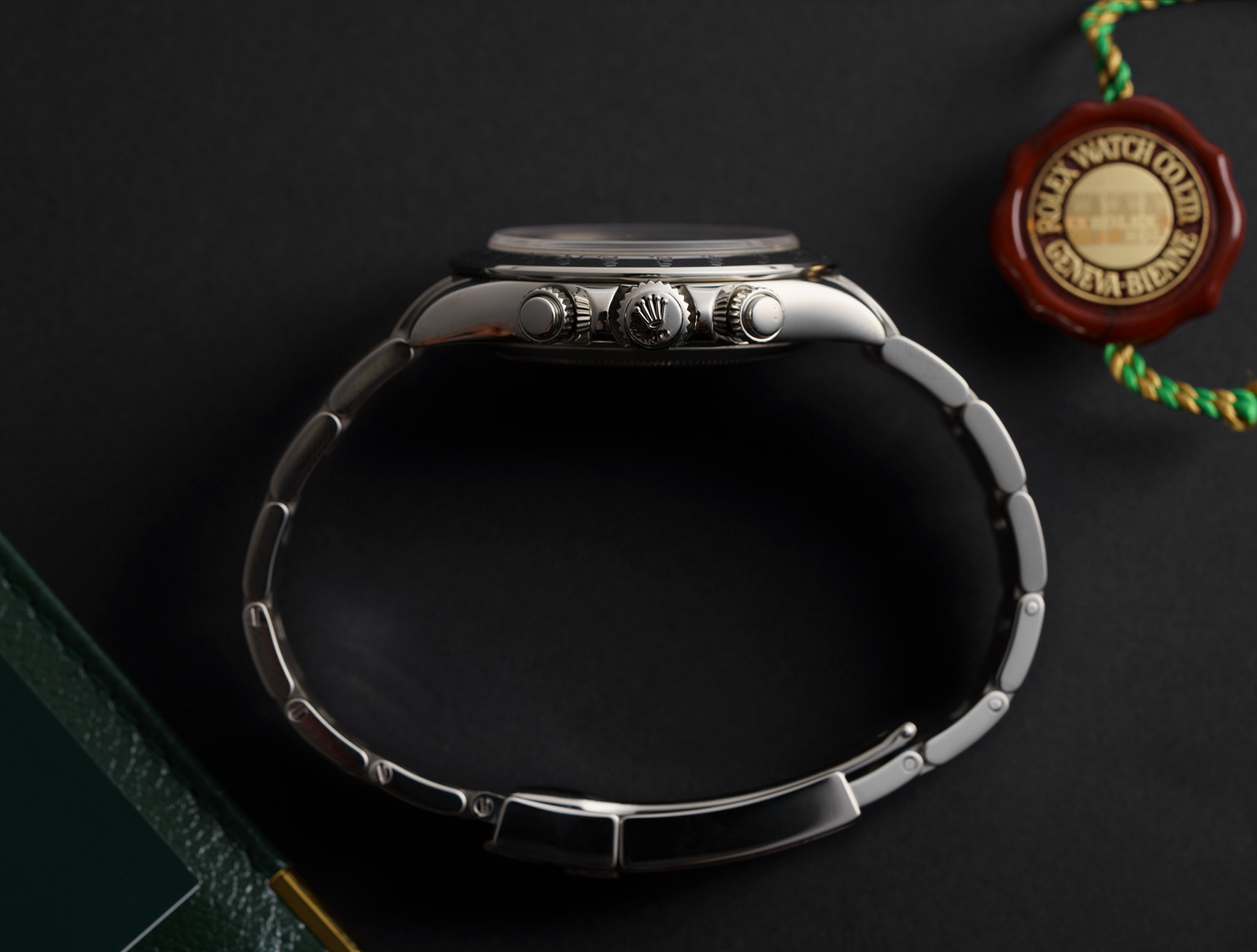 Powered by Rolex's first in-house self-winding Chronograph calibre 4130, waterproof to 100m and fitted to the solid end link '78490' steel Oyster bracelet. Accompanied by its inner & outer Rolex box, Daytona instruction booklet, perforated Rolex Certificate, Chronometer swing tag and green wallet. Guaranteed for two years.