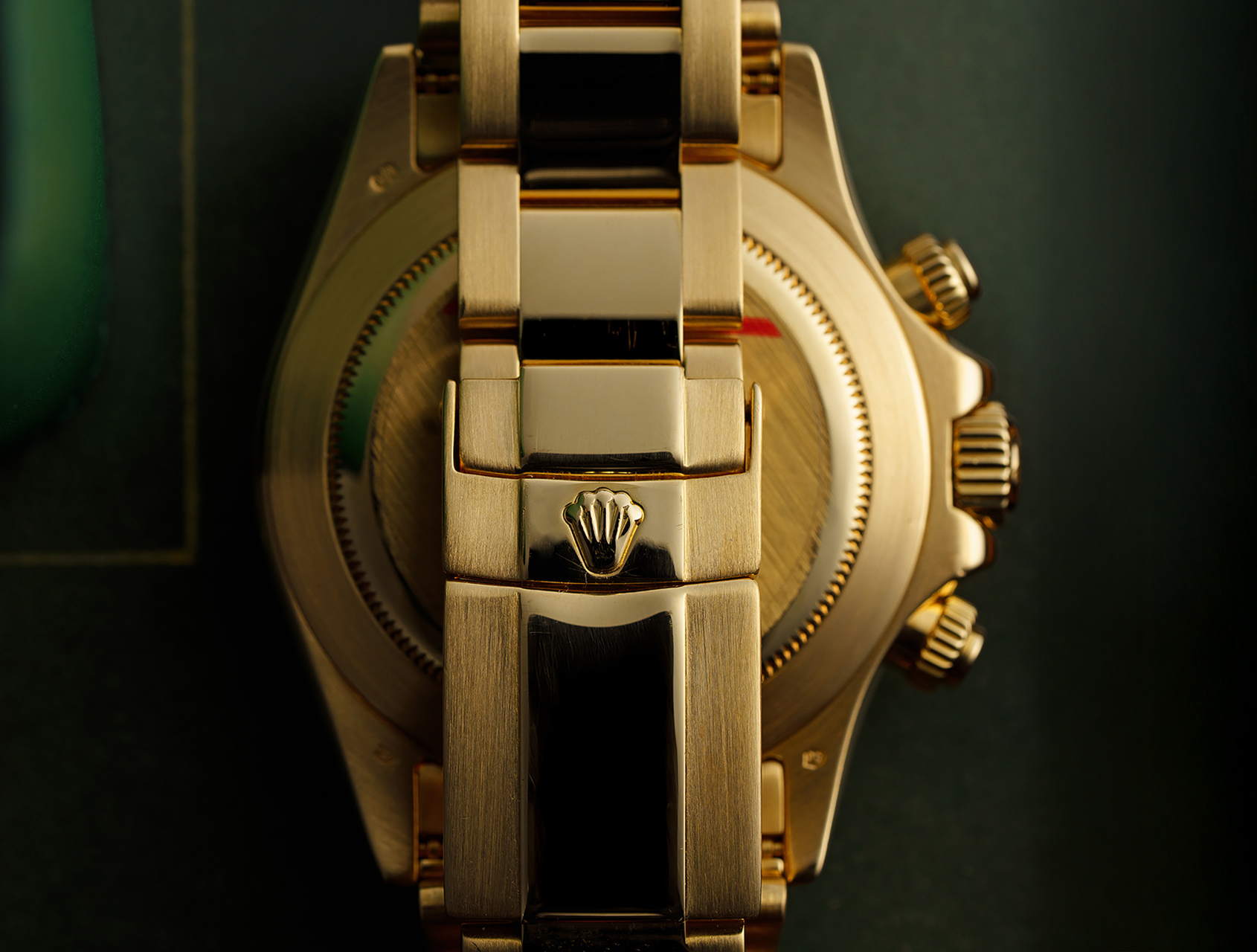 Waterproof to 100m, fitted to the yellow gold Oyster Fliplock bracelet, this self-winding Cosmograph ref. 116528 is powered by the in-house Rolex chronograph calibre 4130. Rolex box, 2 year service warranty card and handy green leather Rolex travel pouch.