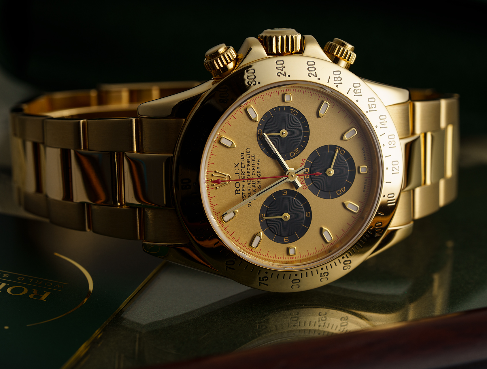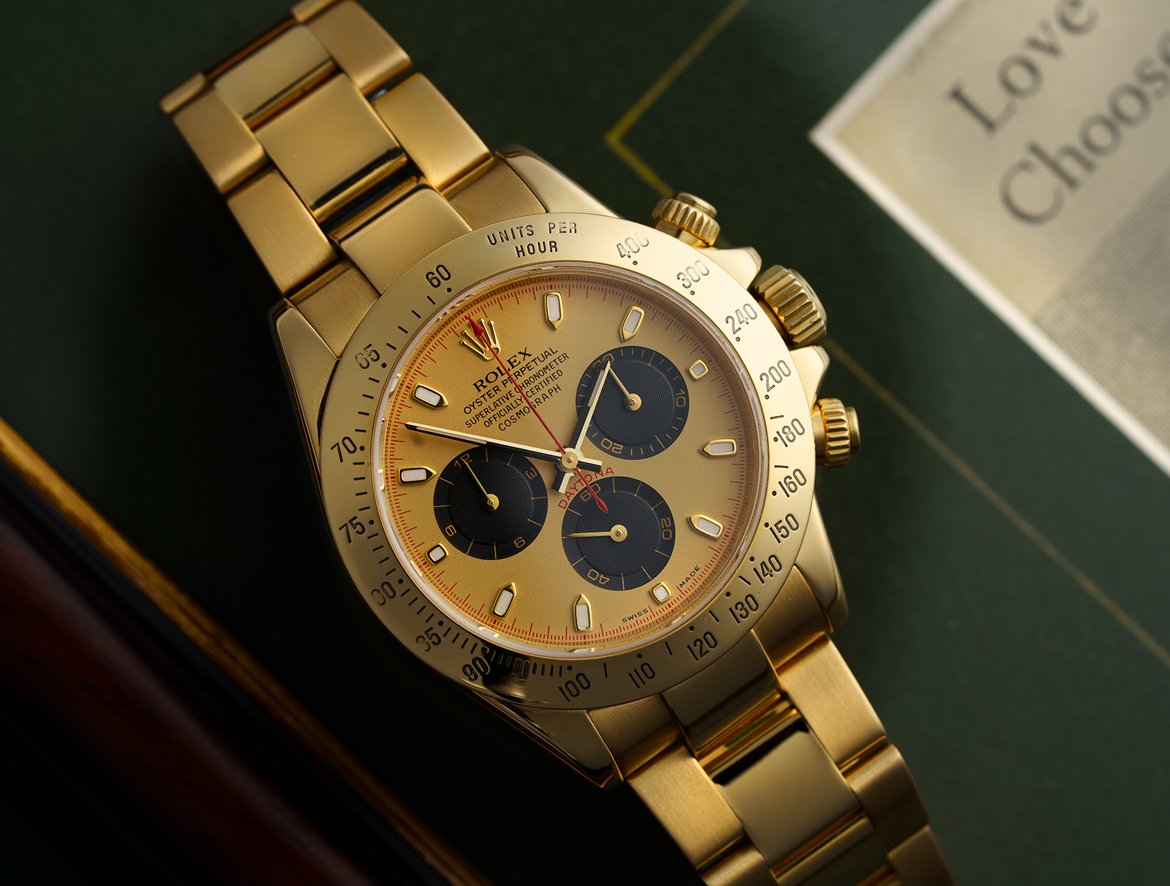 Just serviced by Rolex and under their official warranty to Oct 2027, this is the 18ct yellow gold Cosmograph Daytona with stunning champagne "Paul Newman" dial.