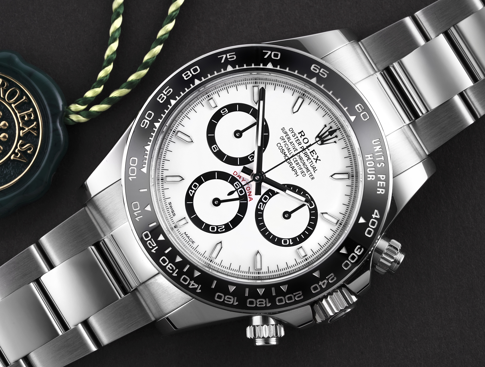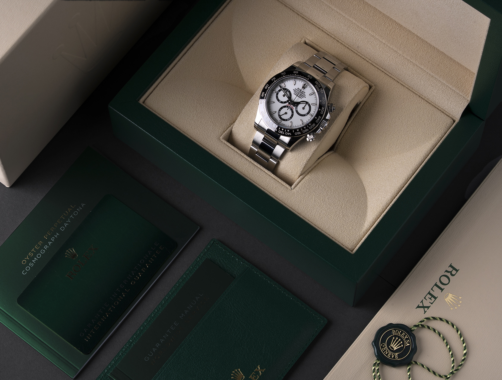 The new reference Panda Daytona, presented as a perfect full-set and under Rolex international warranty until 2029.