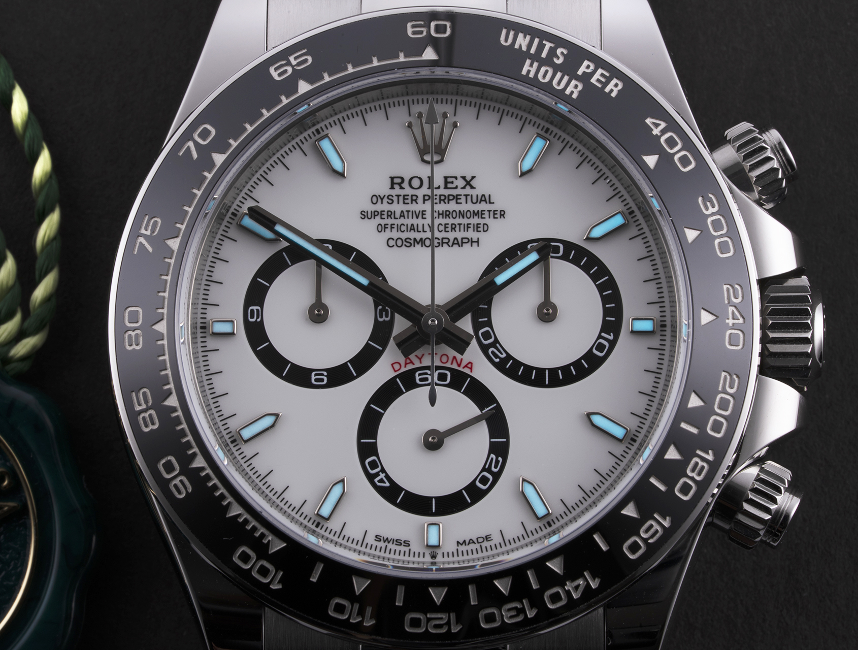 Retailed in Nov 2024, this steel Panda Daytona is offered as a full set with Rolex box, Cosmograph booklets and Rolex warranty card.