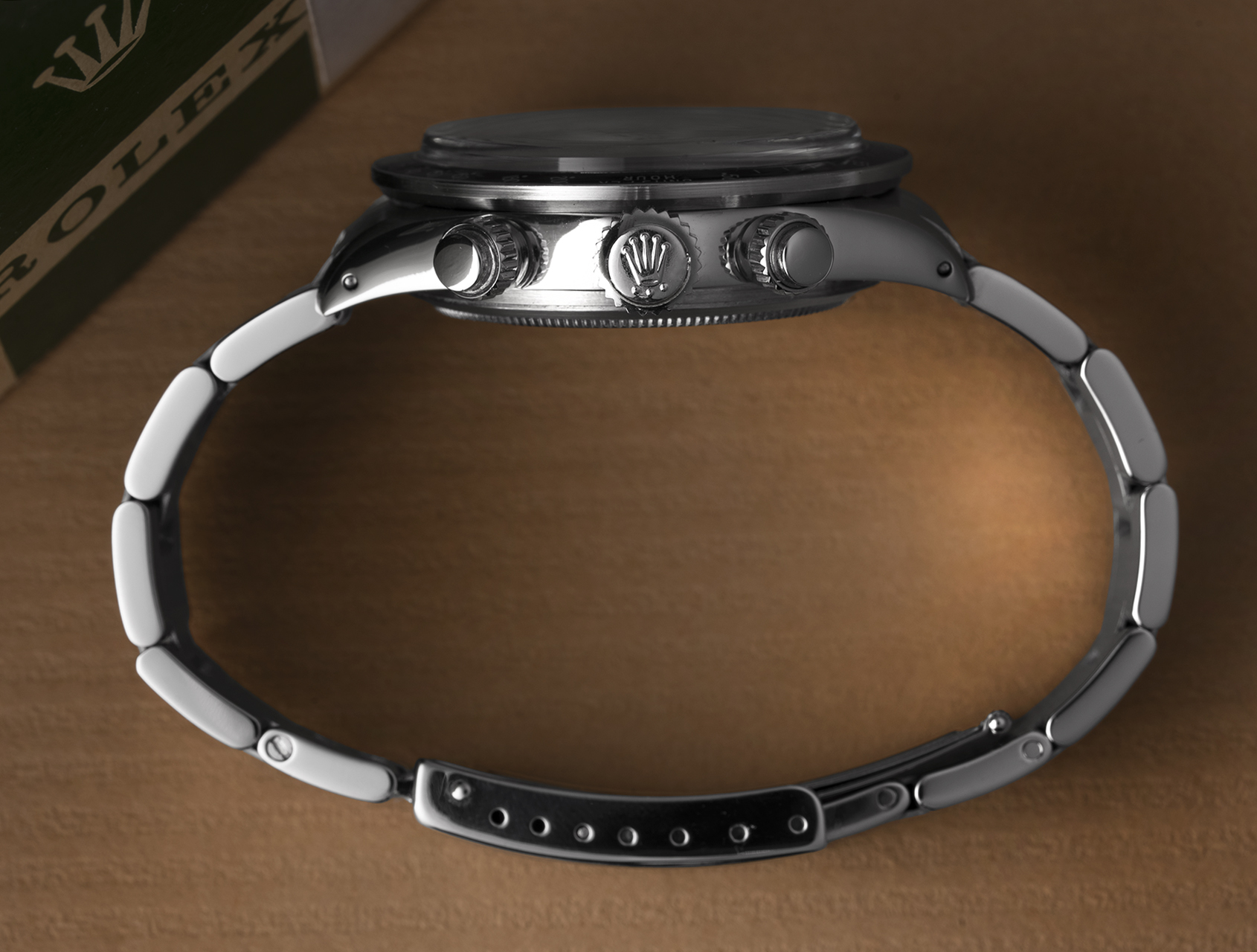 This model is the last of the hand-wound (cal 727), perspex glass Daytonas, that were produced until 1987/88, after which Rolex introduced the automatic movement, sapphire glass ref 16520.