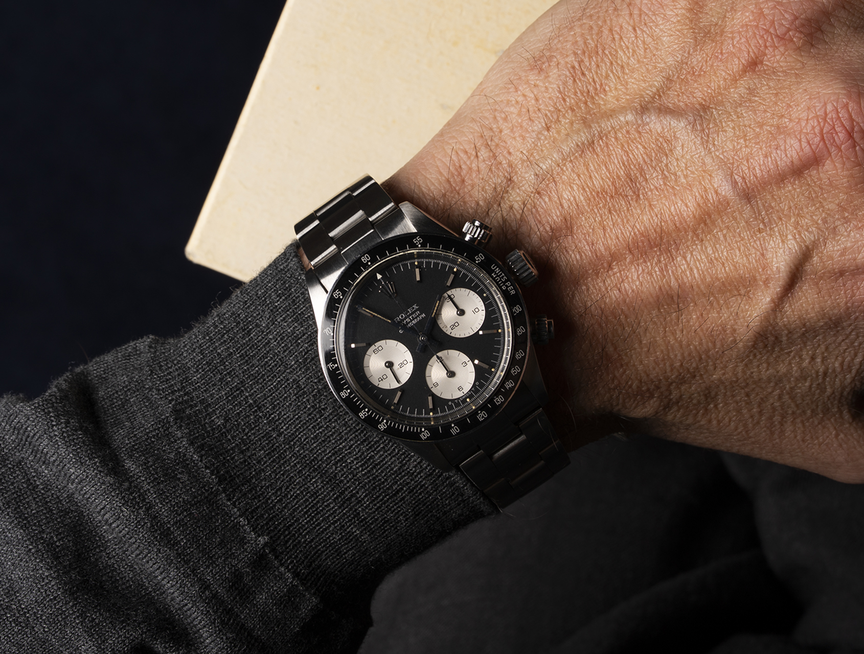 Retailed in 1974, this vintage steel Daytona ref. 6263 with original MK II screw-down pushers, features the sought-after black acrylic bezel, with black Sigma dial (a characteristic of the earlier pre 'big red Daytonas'). Powered by the manually-wound Valjoux caliber 727, these black bezel 6263's are much harder to find than their steel bezel 6265 counterparts, and as a rule with vintage Daytonas, black dials are rarer.