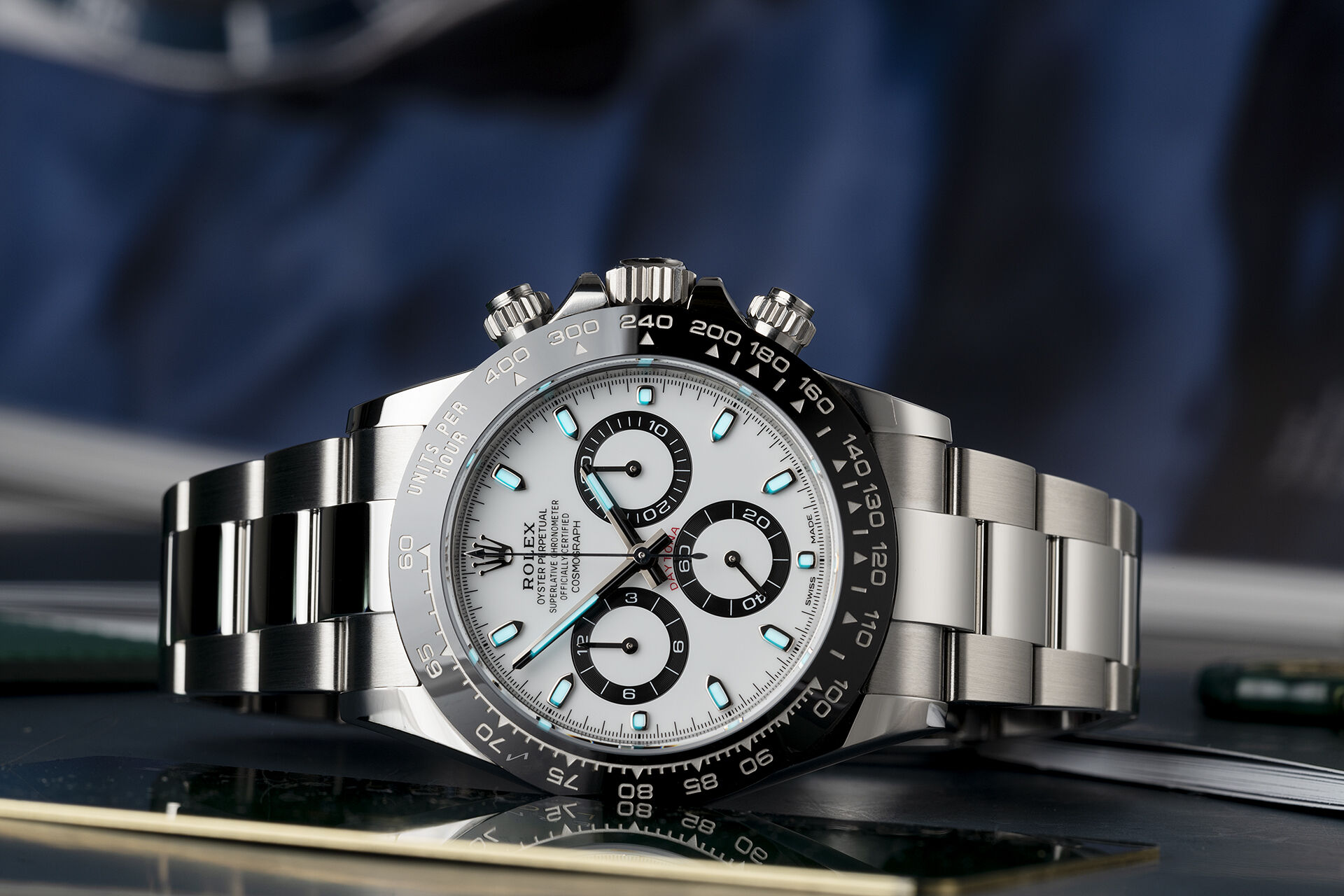 This rare white "Panda" dial Cosmograph Daytona ref. 116500LN is brand new (dated Nov 2021 on the Rolex warranty) and presented complete with its Rolex box, Cosmograph instruction booklets, and 5 year international Rolex warranty card. Powered by Rolex's in-house automatic Chronograph calibre 4130 movement, with 72hr power reserve. Waterproof to 100m.