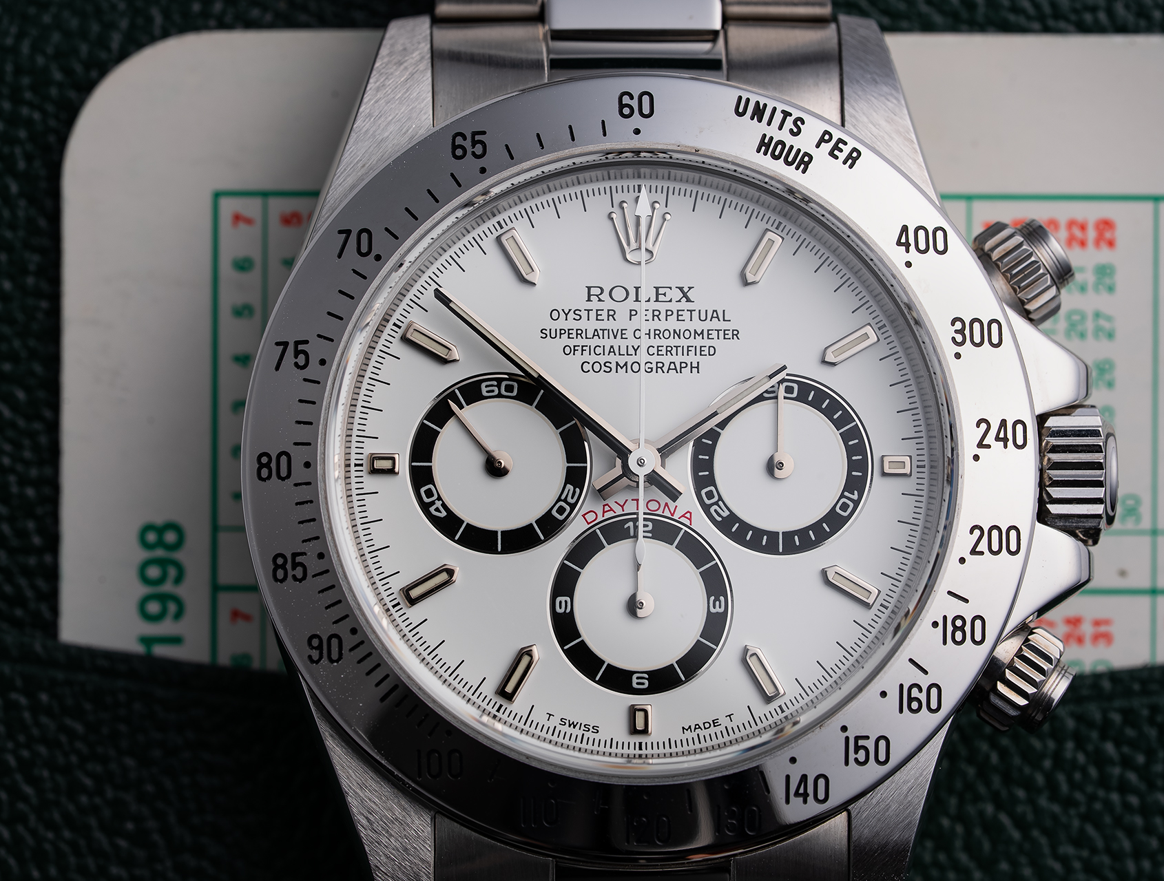 Retailed in Italy in November 1998, quite remarkably this U serial with white tritium dial has never been worn, or barely ever been out of its Rolex box! A genuine new old stock ref. 16520, Rolex's first automatic (powered by the legendary Zenith EL-Primero 4030) chronograph with sapphire crystal glass, complete with perfect factory hologram caseback sticker.