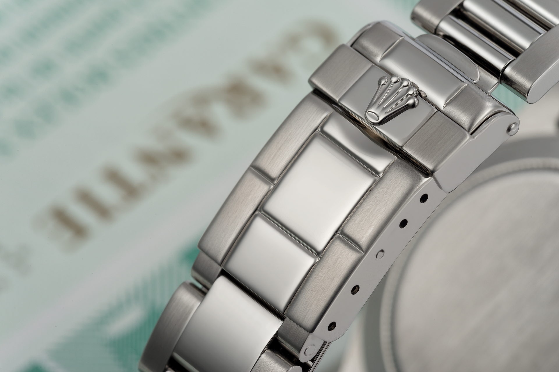 Complete with its original box and punched Rolex papers, this U series 16520 'Zenith' Daytona would have been amongst the last to have its luminous markers powered by Tritium before Rolex switched over to Luminova (that never ages to that lovely cream tone). Powered by the automatic 4030 calibre chronograph movement, this will be be £30k next year.