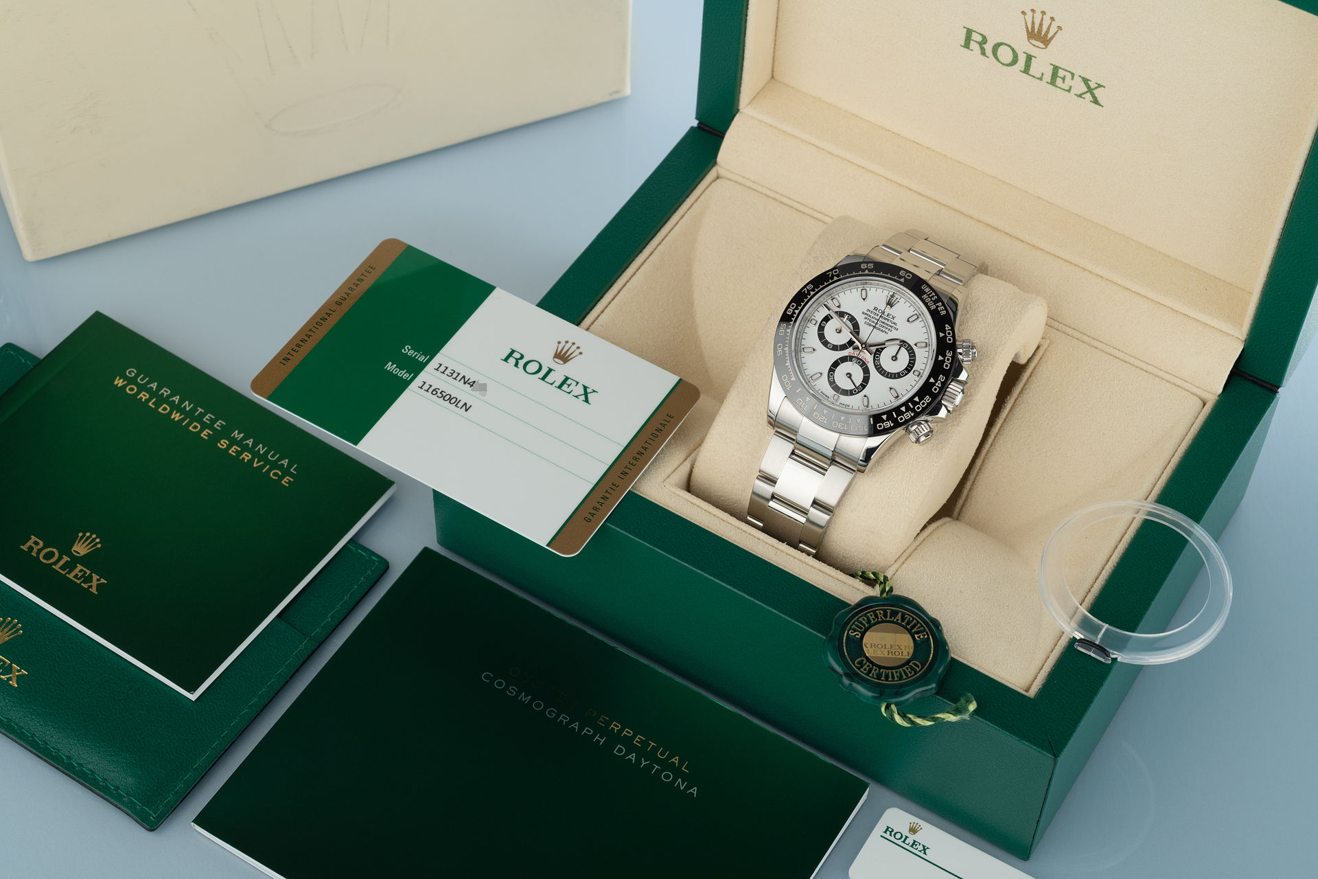 The most sought after wristwatch in the world, this is the latest model 116500LN Cerachrom bezel Daytona with the even-harder-to-find white dial. From the first year of production, complete with Rolex box, warranty papers and tags, and under Rolex international warranty to October 2021.