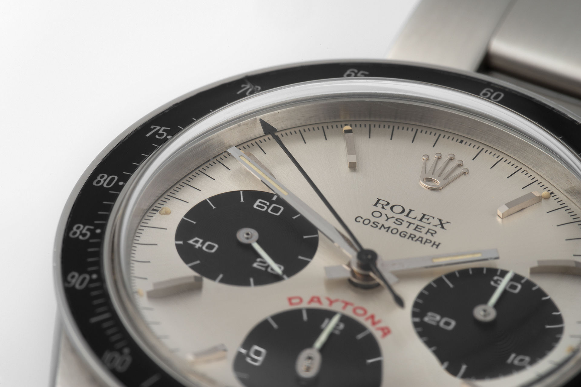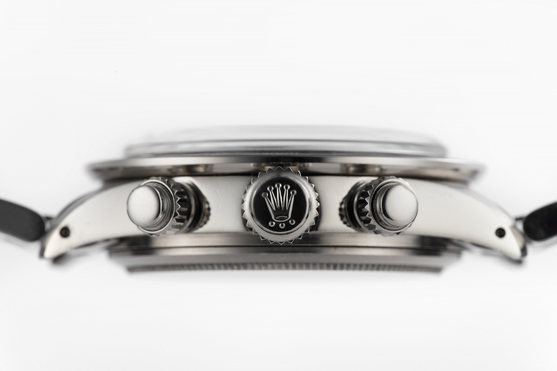 This excellent 6263 Cosmograph Daytona 'Big Red' from 1985 is the perfect Panda. Packed with important original features that include a beautiful solei dial with warm ivory coloured lume plots (and matching hands) the original domed Plexiglas, correct 24-P302 chrono pushers and rare MK III black acrylic bezel. Powered by the caliber 727 manually wound movement, this important chronograph is one of the most coveted watches in the world.
