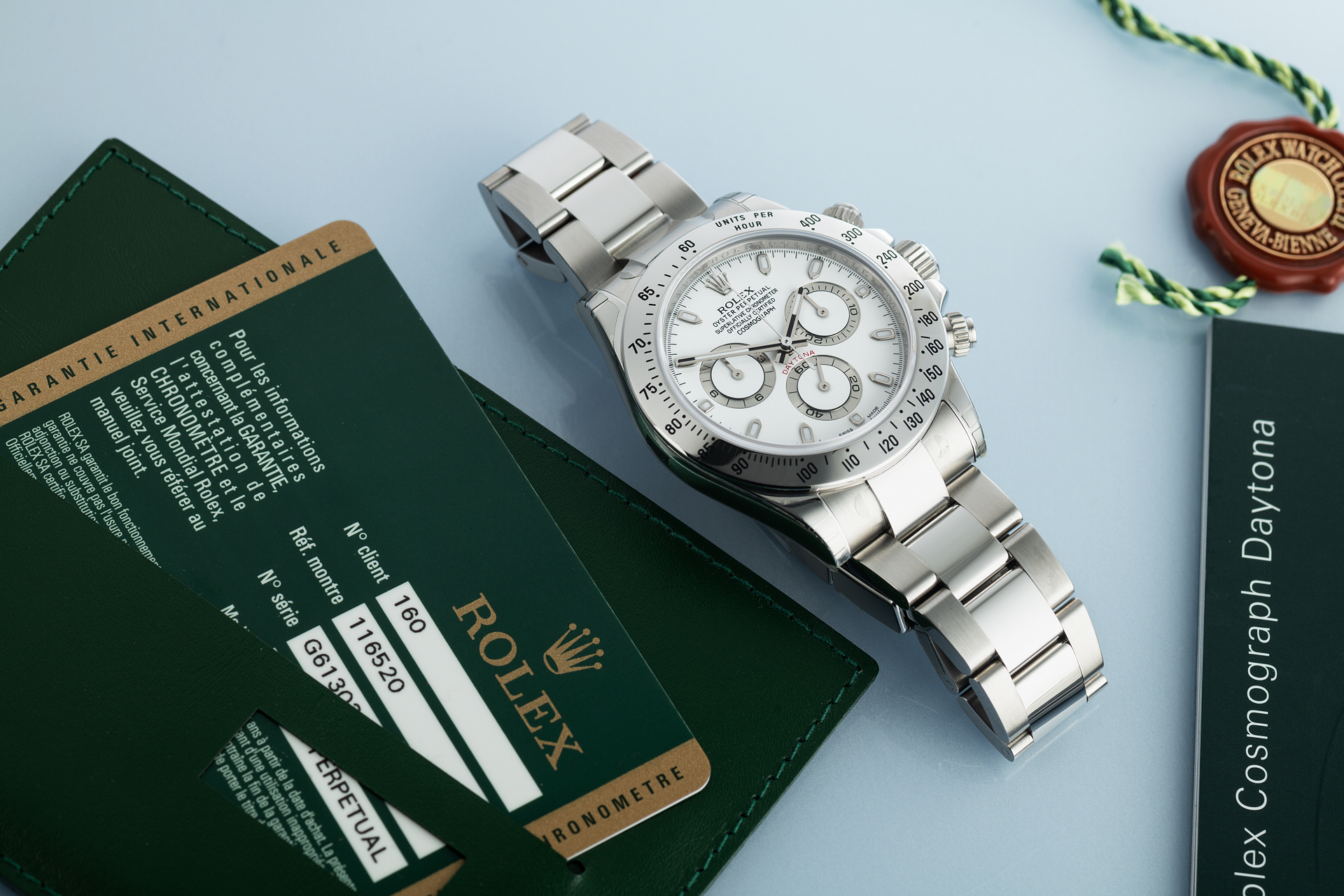 UK retailed white dial Cosmograph Daytona "APH" fully factory stickered and unworn. This investment grade 'error dial' 116520 Daytona is of course complete with its full complement of Rolex box and papers dated July 2012, and even has the original (£7,950) bill of sale! Since being discontinued in favour of the ceramic bezel 116500, savvy collectors have been moving fast to hoover up the last of the few brand new unworn stickered examples left, and tuck them away for the future. We've done the same and strongly suggest you do too...