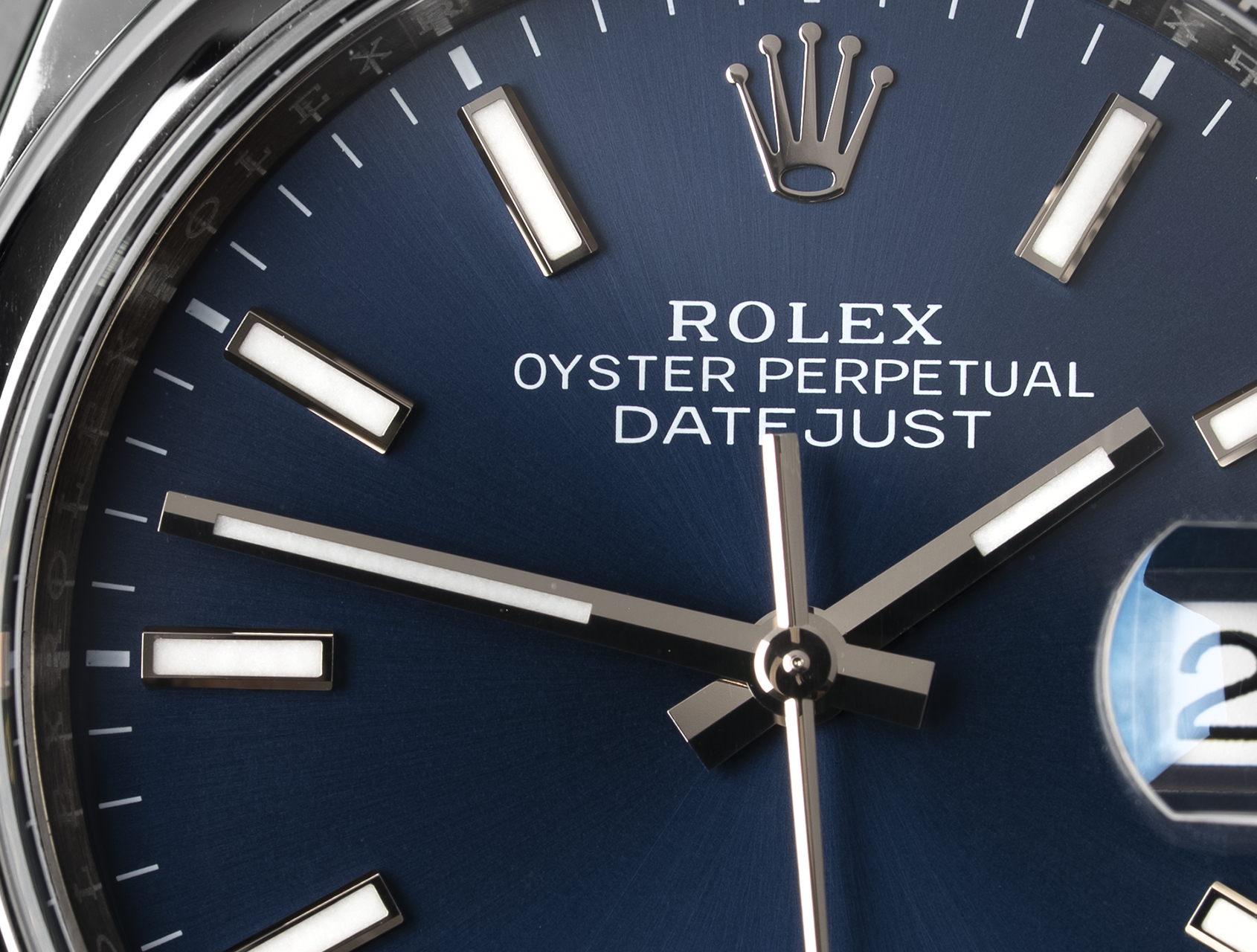 This classic Datejust 36 with attractive bright blue sunray dial and smooth bezel, is in as-new condition. Fitted to the polished centre link Oyster bracelet, powered by Rolex's self-winding calibre 3235, and waterproof to 100m.