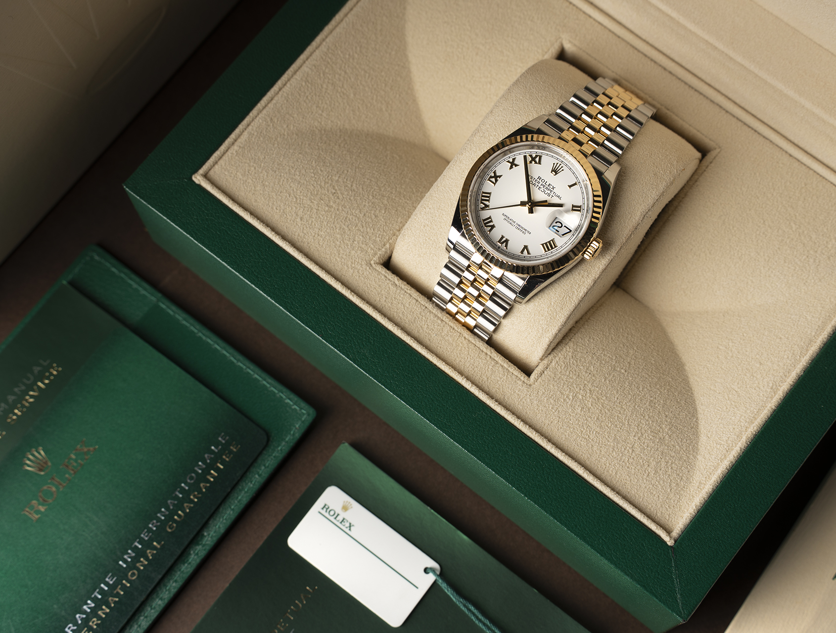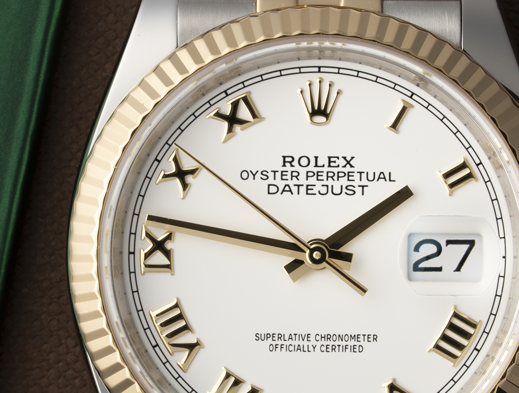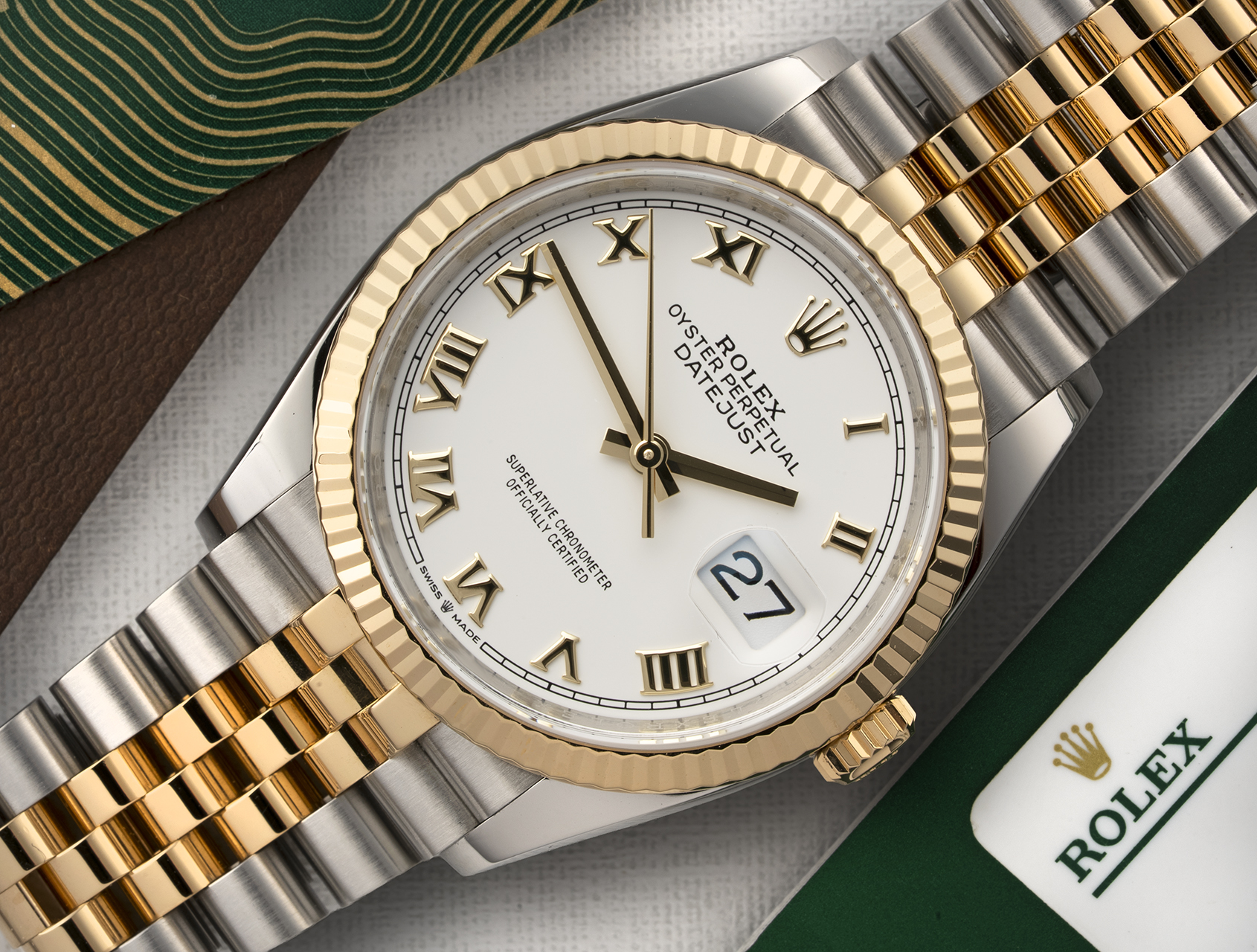 36mm two-tone case with 18ct yellow gold fluted bezel, fitted to the comfortable matching Jubilee bracelet with secure Oysterclasp. Rolex self-winding calibre 3235, waterproof to 100m.
