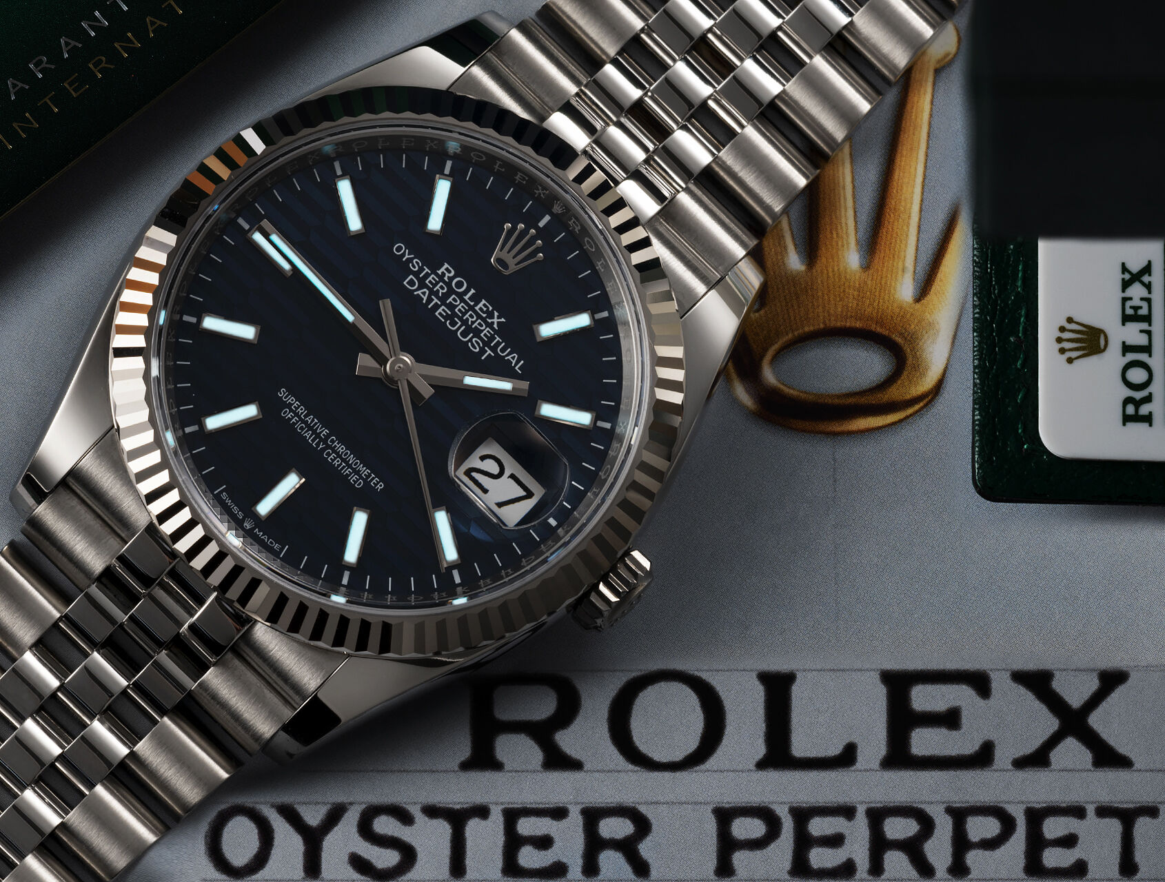 Brand new and under Rolex international warranty to July 2028, this is the 36mm steel Datejust ref 126234. The combination everyone wants; the solid 18ct white gold fluted bezel fitted to the comfortable Jubilee bracelet. Powered by the automatic calibre 3235 with improved 70hr power-reserve, waterproof to 100m.