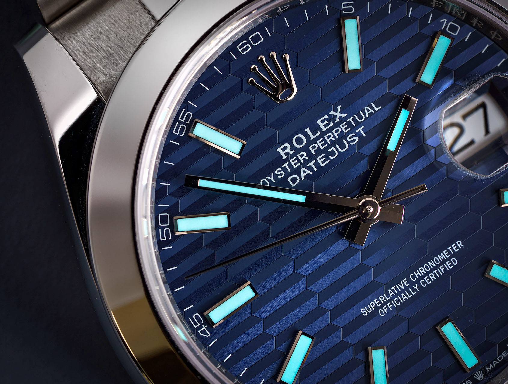 One of the only examples available in the UK, A modern classic elevated by its blue fluted motif dial, this is the Rolex Datejust 41 ref. 126300.