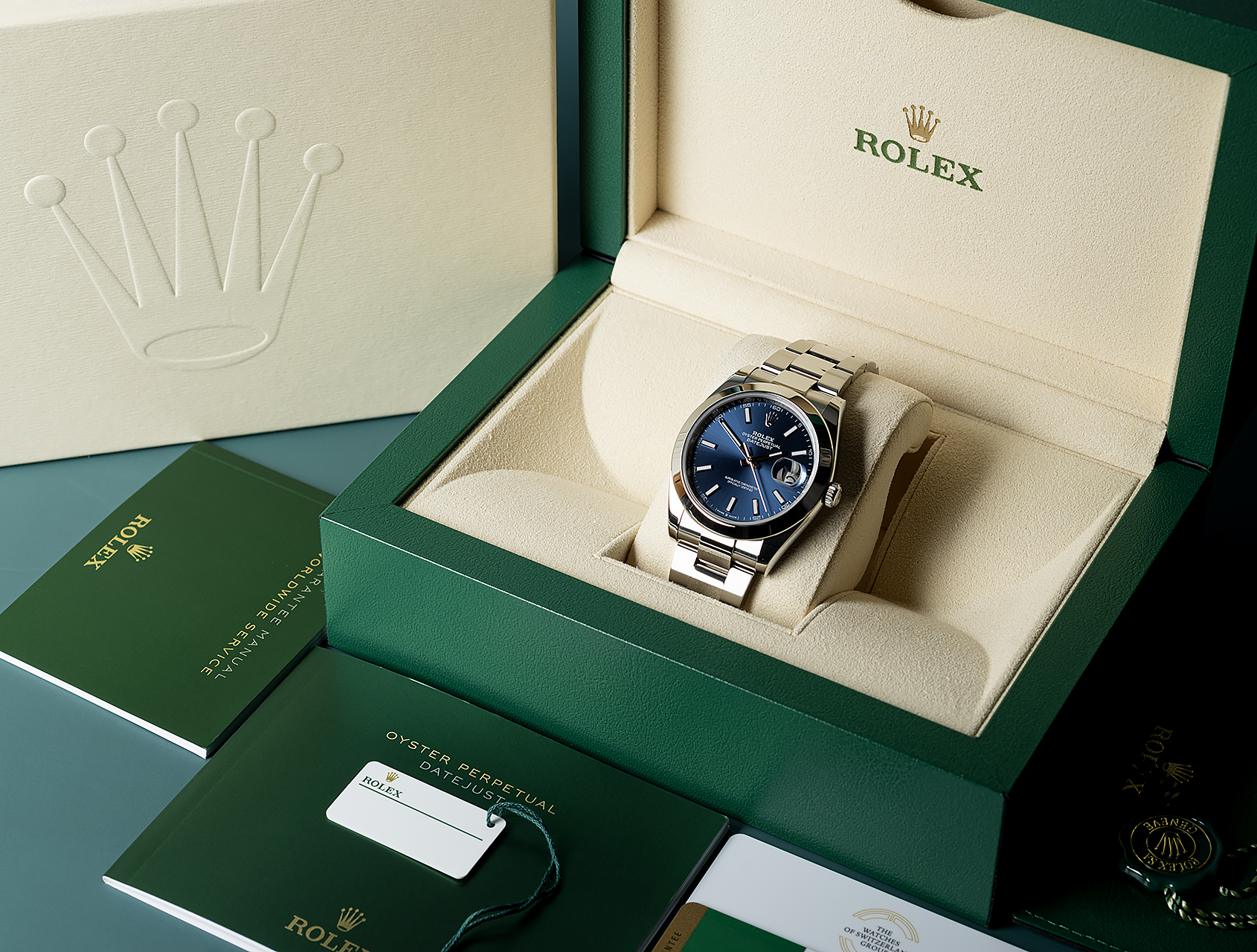 Rolex self-winding calibre 3235 with improved 70-hr power reserve, waterproof to 100m. Rolex box, booklet, Datejust instructions, both swing tags, WOS card, and Rolex international warranty dated July 2019.