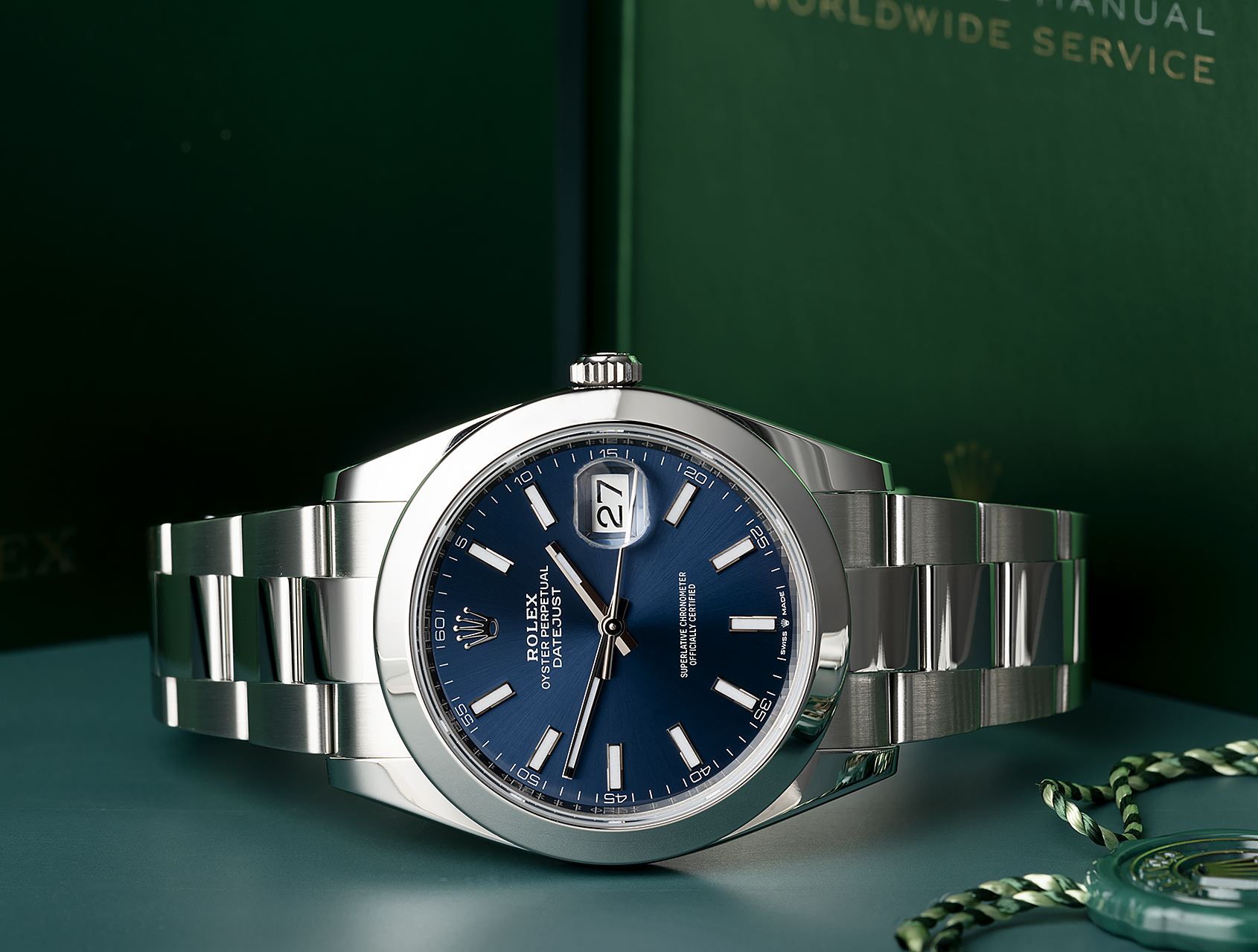 This latest steel Datejust 41 ref 126300, features Rolex's attractive bright blue dial, with Chromalight luminous baton hour markers and a smooth bezel.