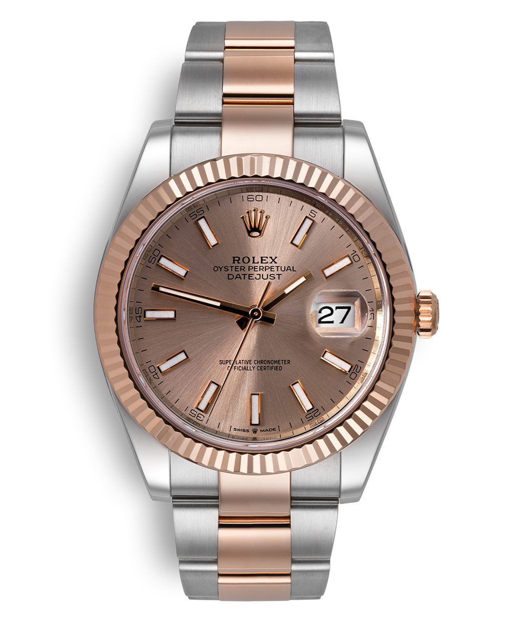 This latest Datejust 41 ref. 126331 in Everose gold & steel features the attractive Sundust dial, lightly brushed to create delicate reflections across the rose dial, and contrasting chromalight luminous indexes. The warm tones of the rose gold elevate this 41mm Datejust even further. Fitted with the 18ct rose gold fluted bezel, paired with its matching two-tone Oyster bracelet, and powered by Rolex's upgraded self-winding calibre 3235. Waterproof to 100m.