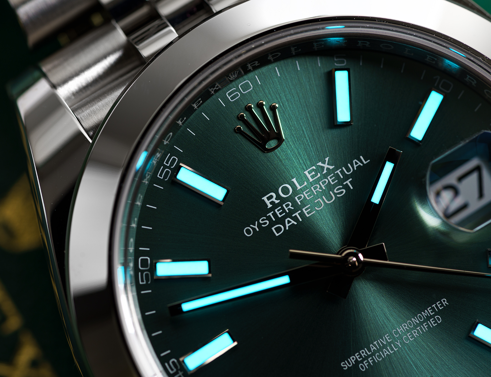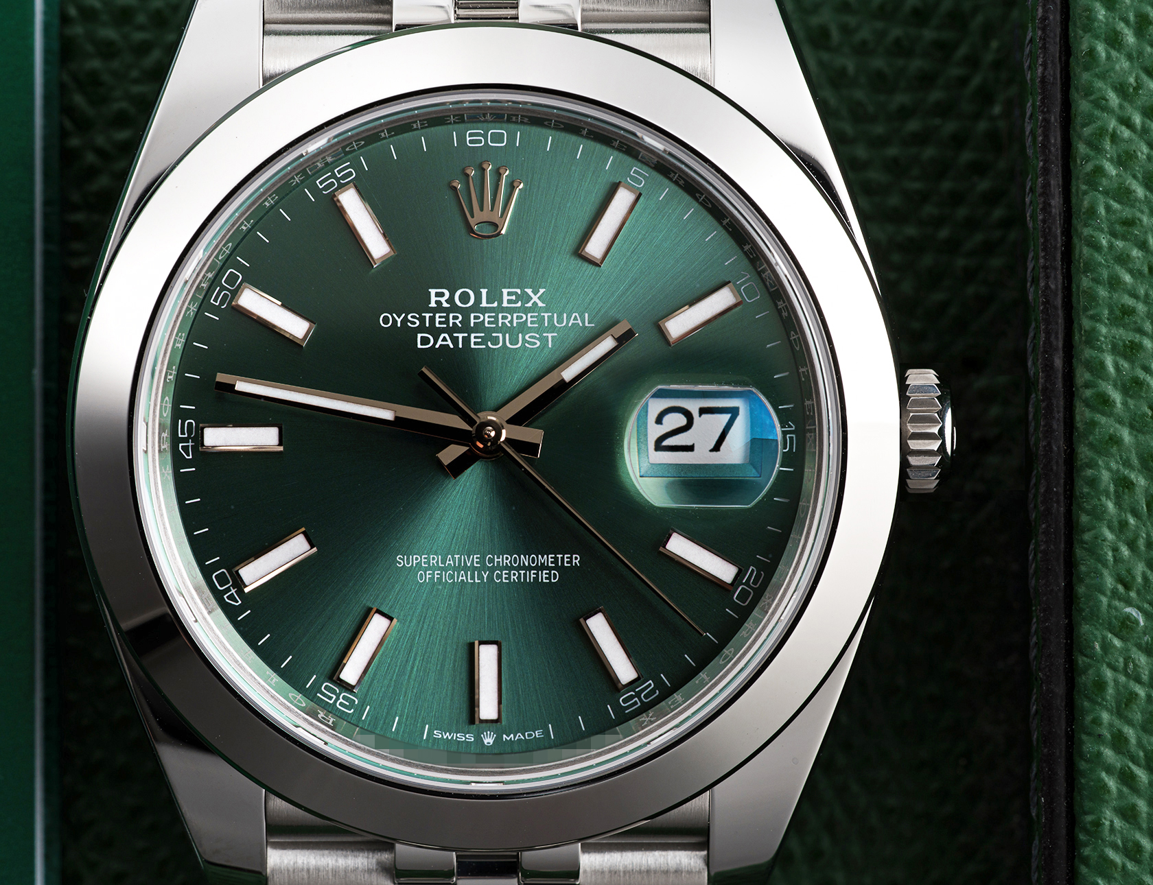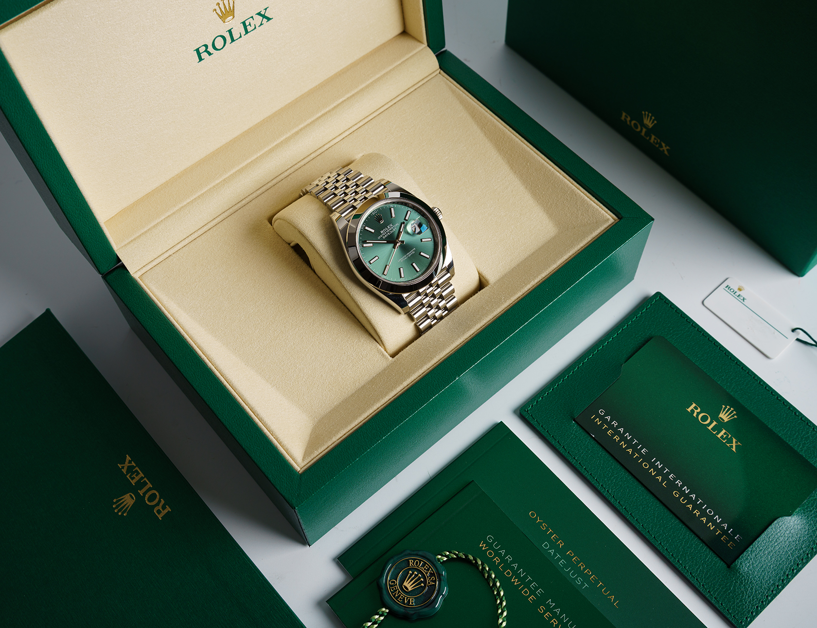 UK retailed just days ago and presented complete with its Rolex box & certificate, this brand new Datejust 41 with mint green dial is under official Rolex warranty until November 2030.