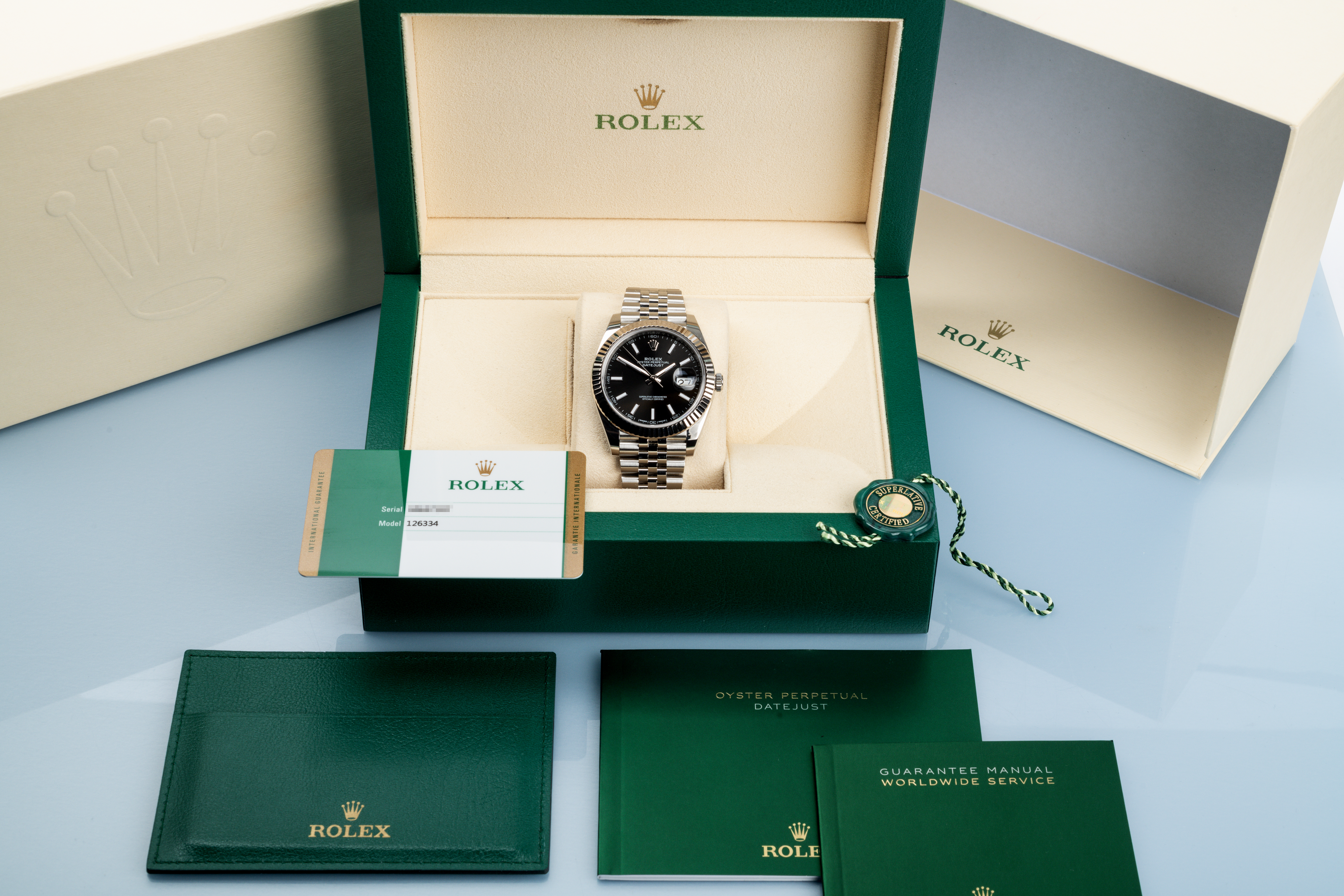 Brand new from September 2019, this is the latest model Datejust 41 with 18ct white gold fluted bezel, 3235 calibre automatic movement (with improved 70hr power reserve) and is under rolex international warranty to 2024. Sporting the cool black dial (with dark metallic charcoal tones) and waterproof to 100m, this 126334 is complete with its full complement of original Rolex box, warranty card, tags and booklets.