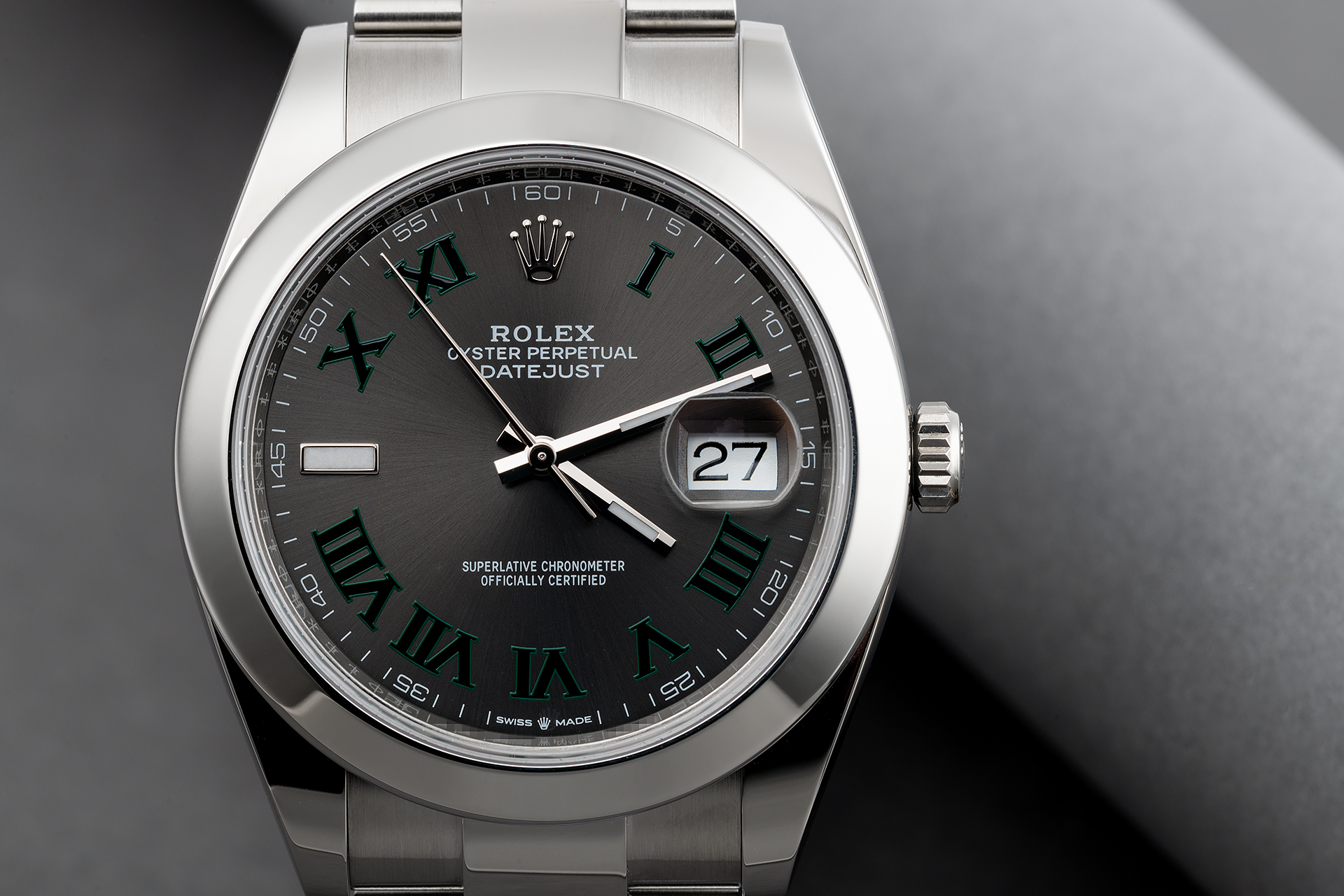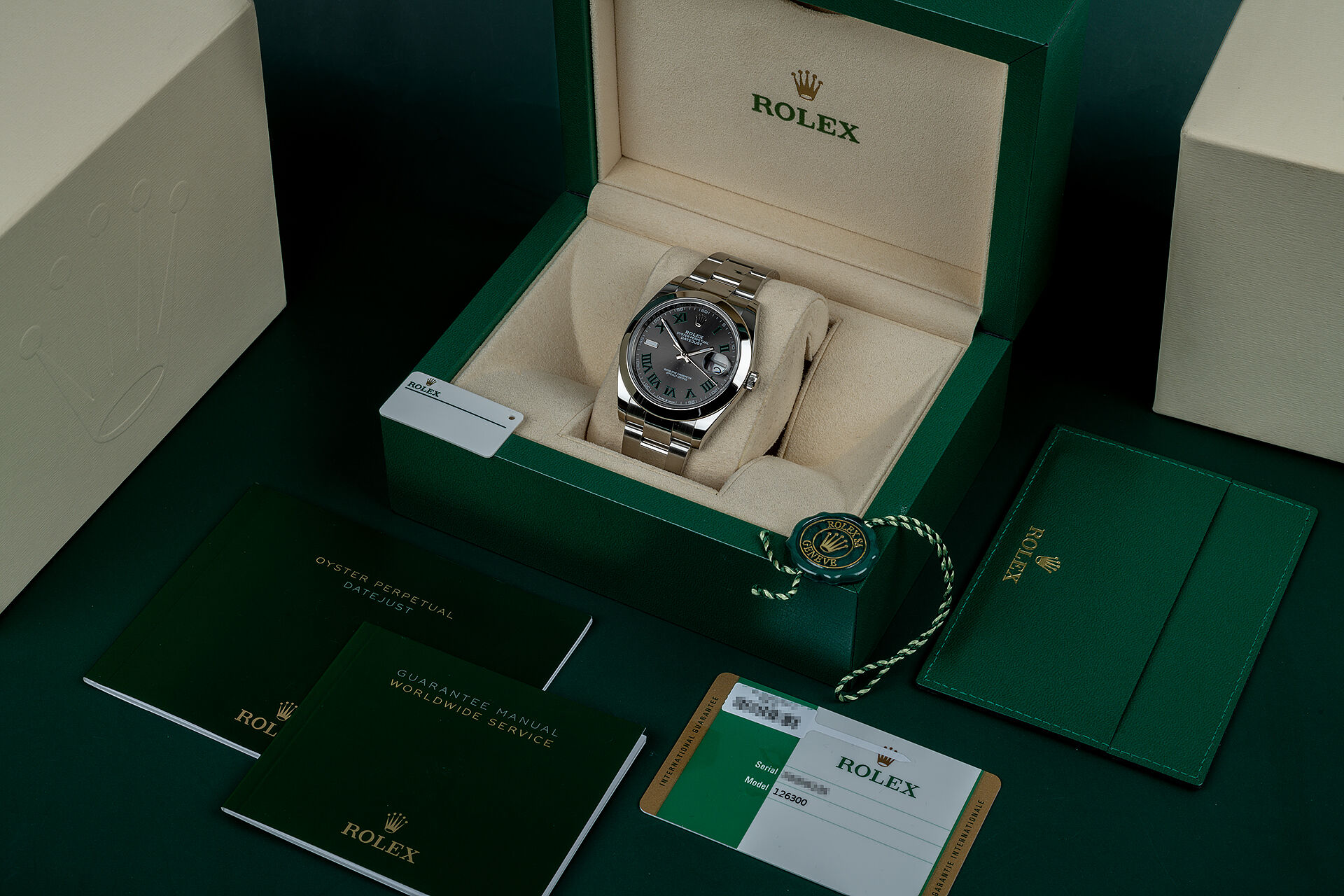 Featuring the most sought-after Rhodium grey "Wimbledon" dial with roman numerals highlighted in green, this latest gentleman's Datejust 41mm in stainless steel, was purchased in the UK in May 2018.