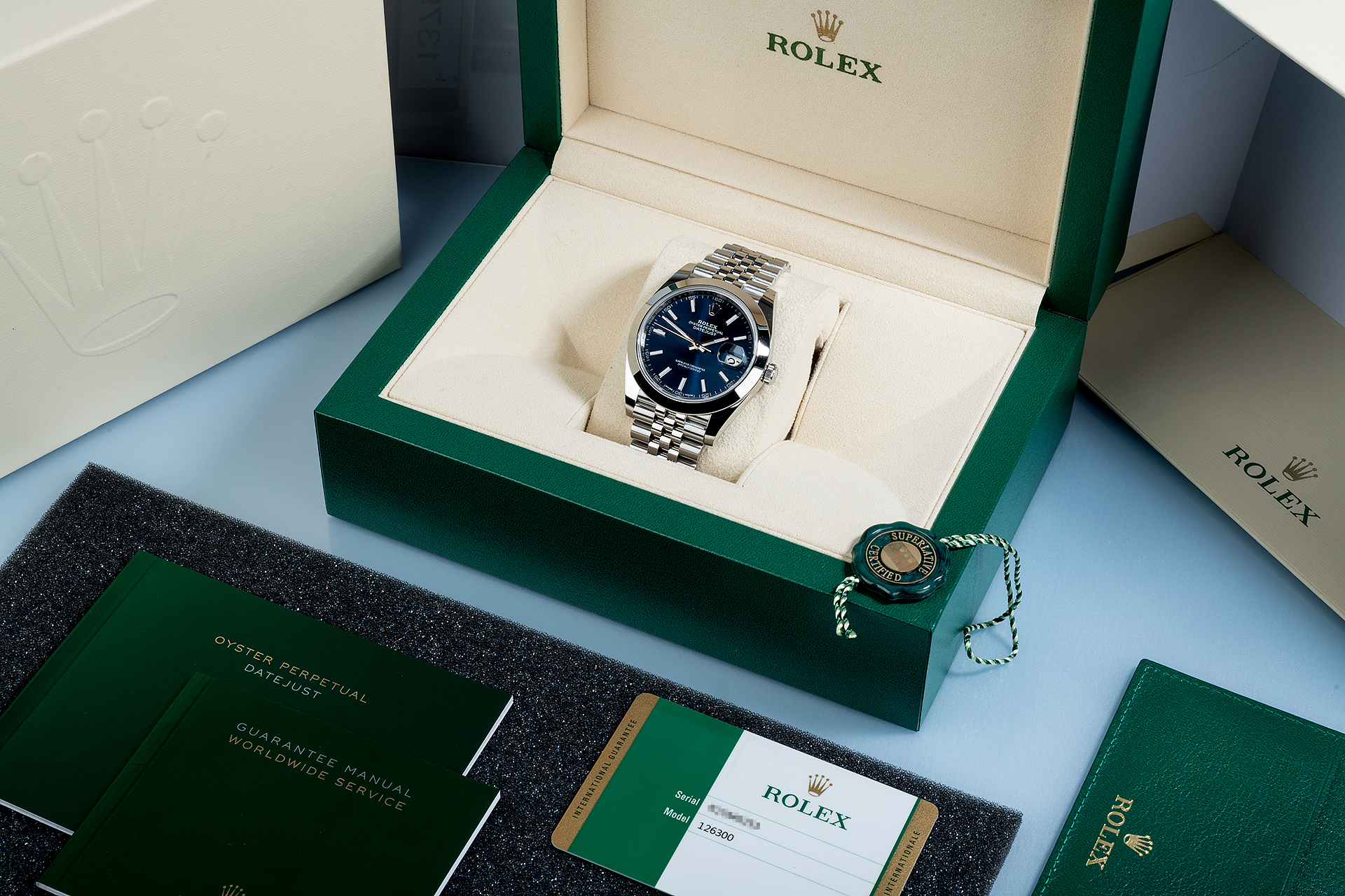 This 41mm stainless steel Datejust (126300) features the 'Bright Blue' dial, smooth domed bezel and coveted Jubilee bracelet, with 5mm Easylink extension. Rolex's upgraded self-winding calibre 3235 movement, with improved 70-hour power reserve, waterproof to 100m.