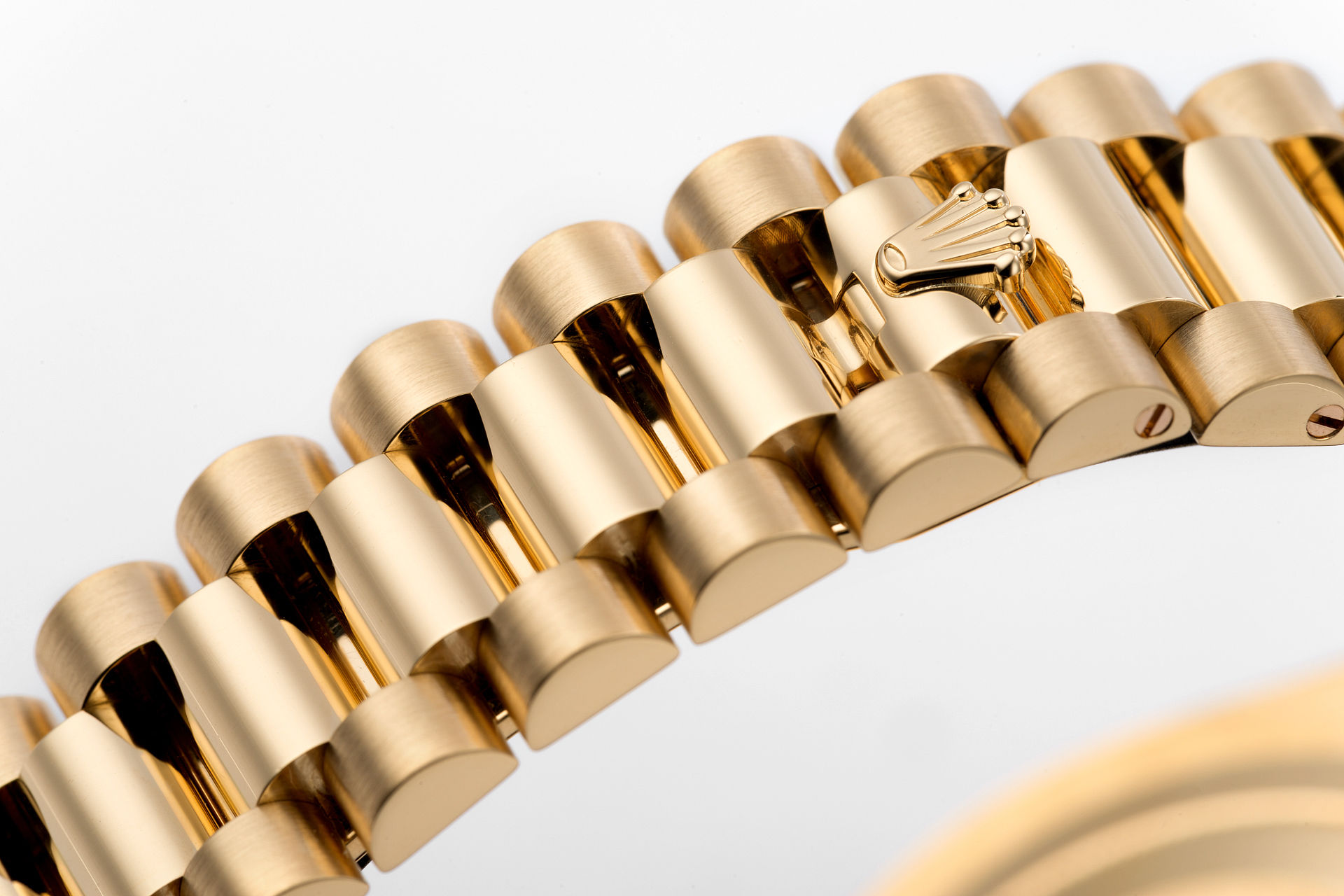 This large 41mm solid 18ct yellow gold Day-Date II is in superb condition. Originally retailed by Harrods, this 218238 model was made for a short period of time, and features the rare champagne dial with 10 factory set diamond hour markers. Fitted to the solid gold President bracelet with concealed Crown clasp and powered by Rolex's automatic calibre 3156 movement. Waterproof to 100m and complete with its Rolex box, booklets, swing tags and UK stamped Rolex warranty card.