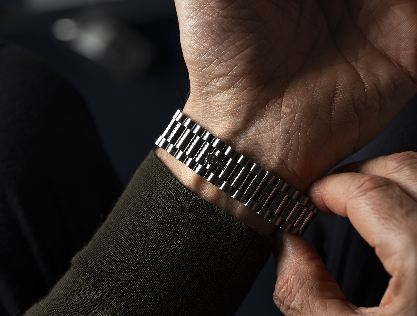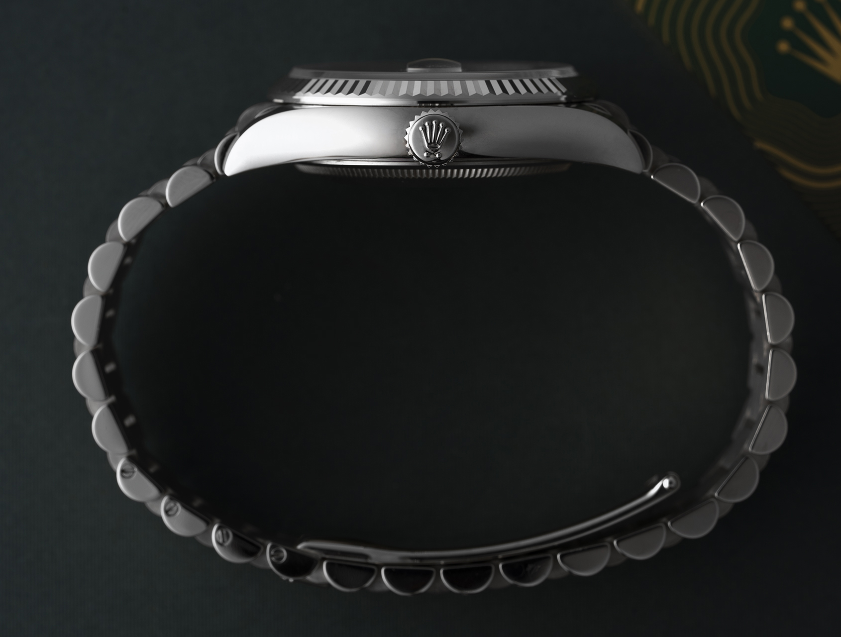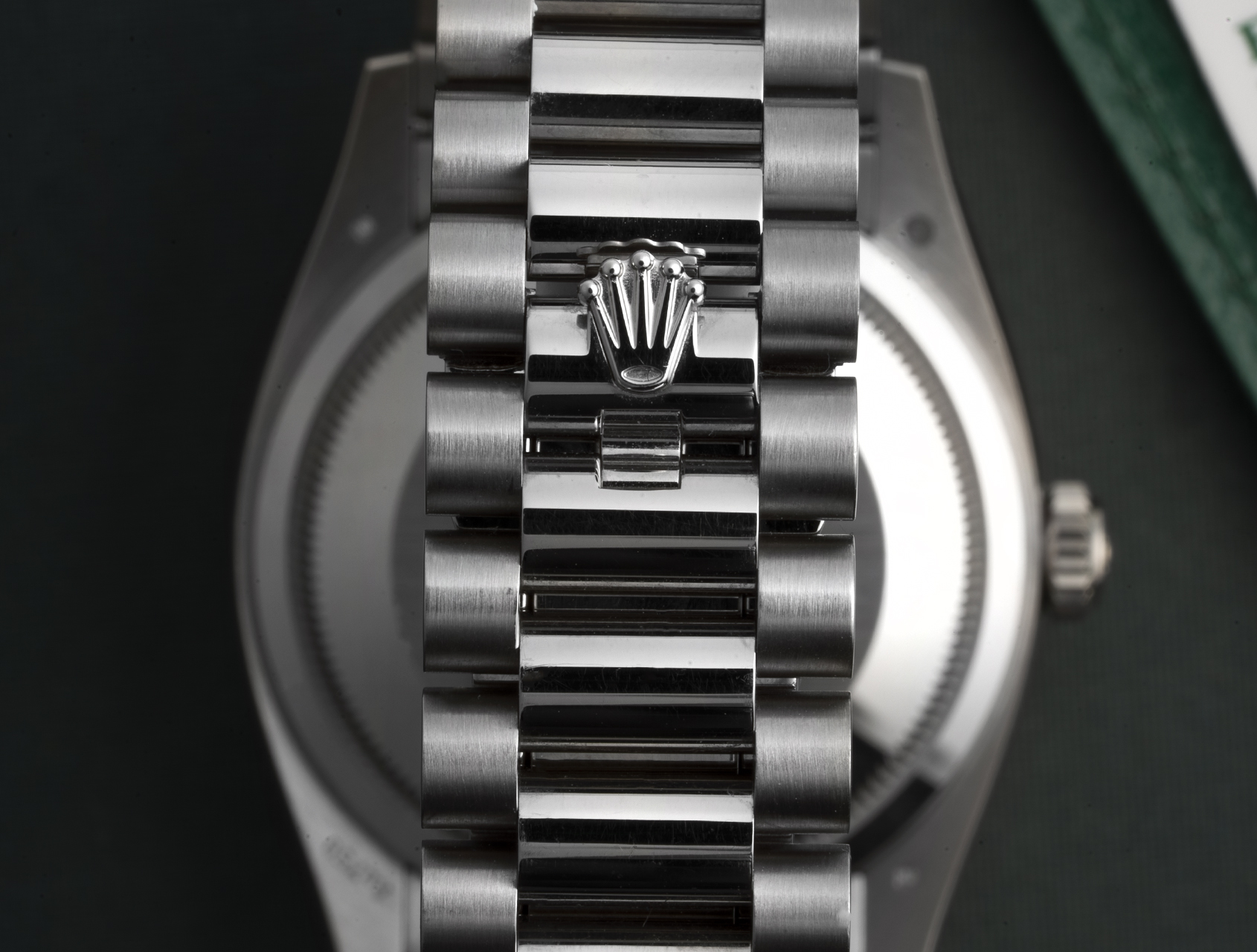 Powered by Rolex's self-winding calibre 3255, waterproof to 100m and fitted to the solid white gold President bracelet with concealed clasp.