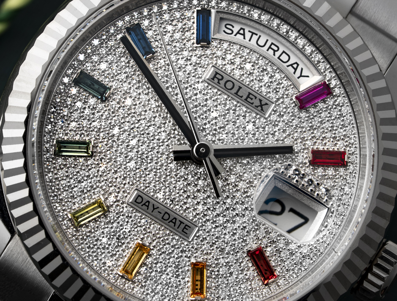 The brilliant diamond-encrusted dial features 10 baguette-cut, rainbow-coloured sapphires that were expertly set by Rolex's master gem setters, with sleek Onyx hour and minute hands to enhance legibility. The traditional Day & Date apertures are at 12 & 3.