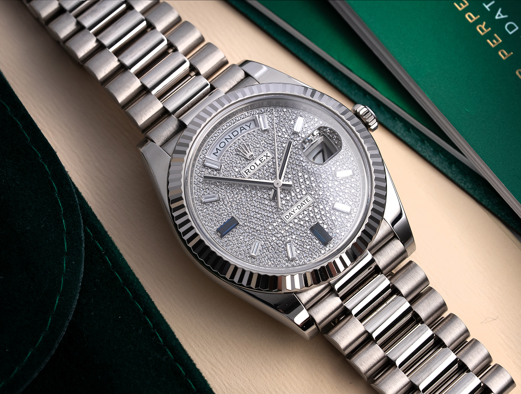 One of the rarest modern Day-Dates produced, with just a handful of examples for sale globally. This is the 18ct white gold Day-Date 40 ref. 228239, with hand-set pavé diamond and baguette dial.