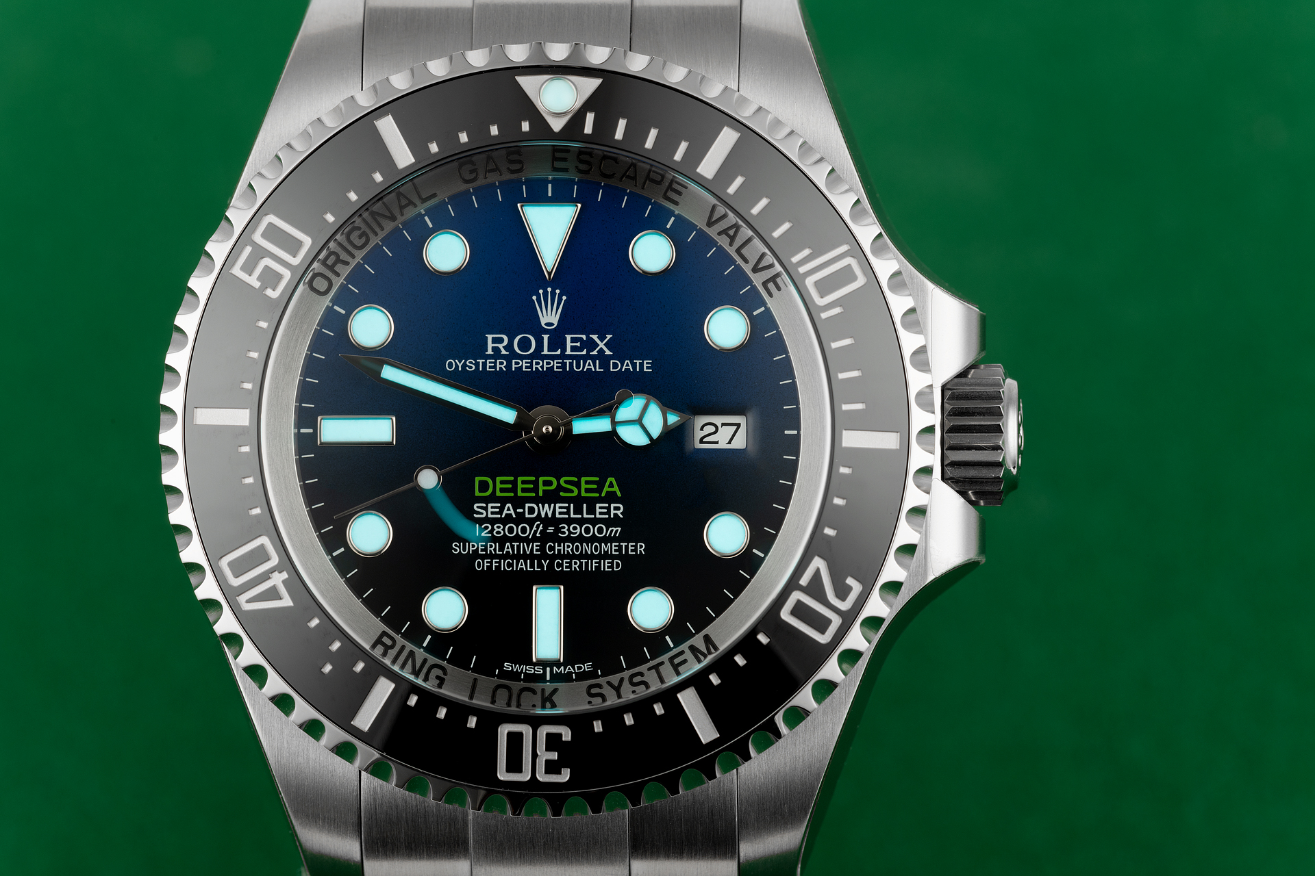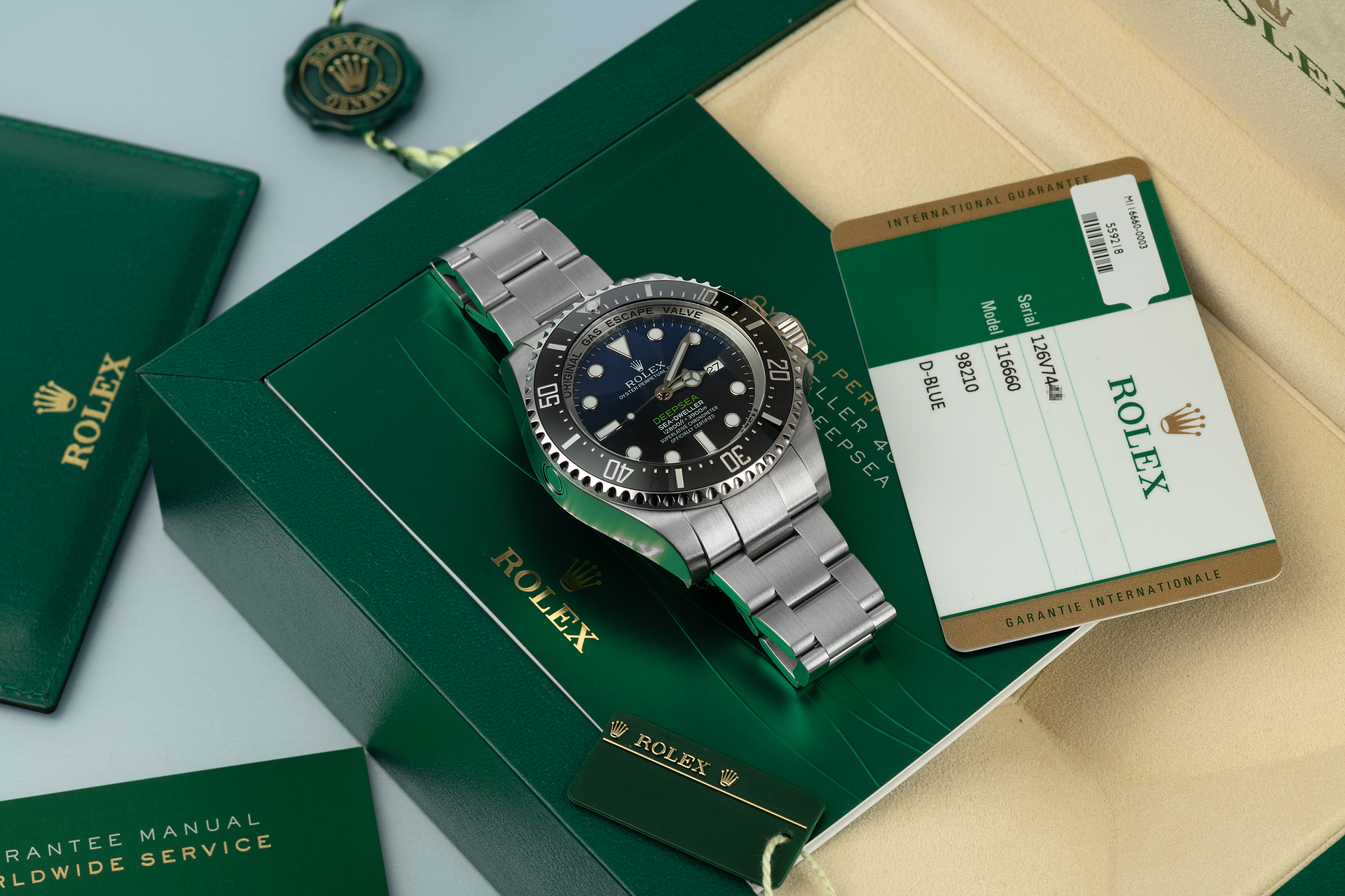 Brand new, fully stickered and under Rolex international warranty until July 2020. Now discontinued, this Deepsea D-Blue features the blue/black dial and is waterproof to an incredible 3900m. Only produced for 4 years, the 116660 D-Blue is one of the shortest production run watches ever produced by Rolex. Presented totally complete with its Rolex box, booklet, bezel cover, swing tags and UK stamped 5 year Rolex warranty card.