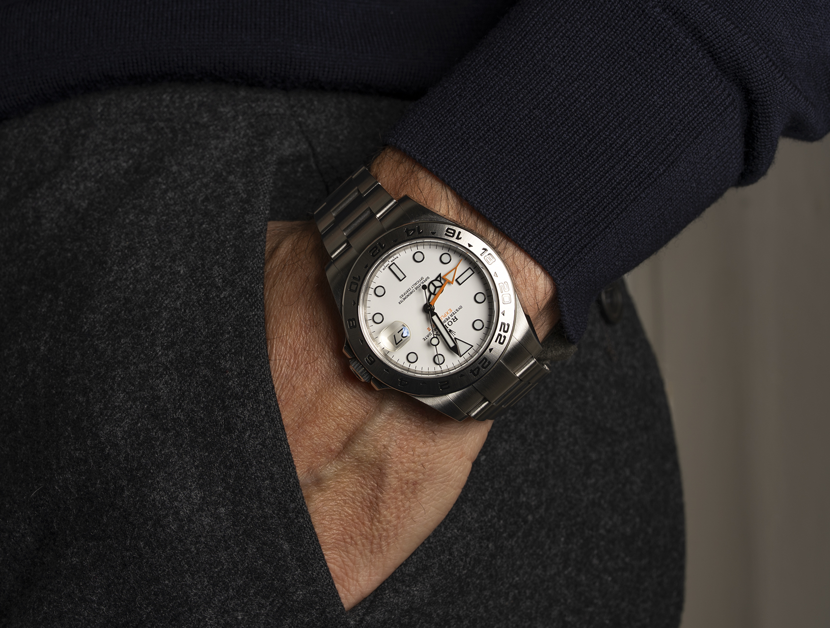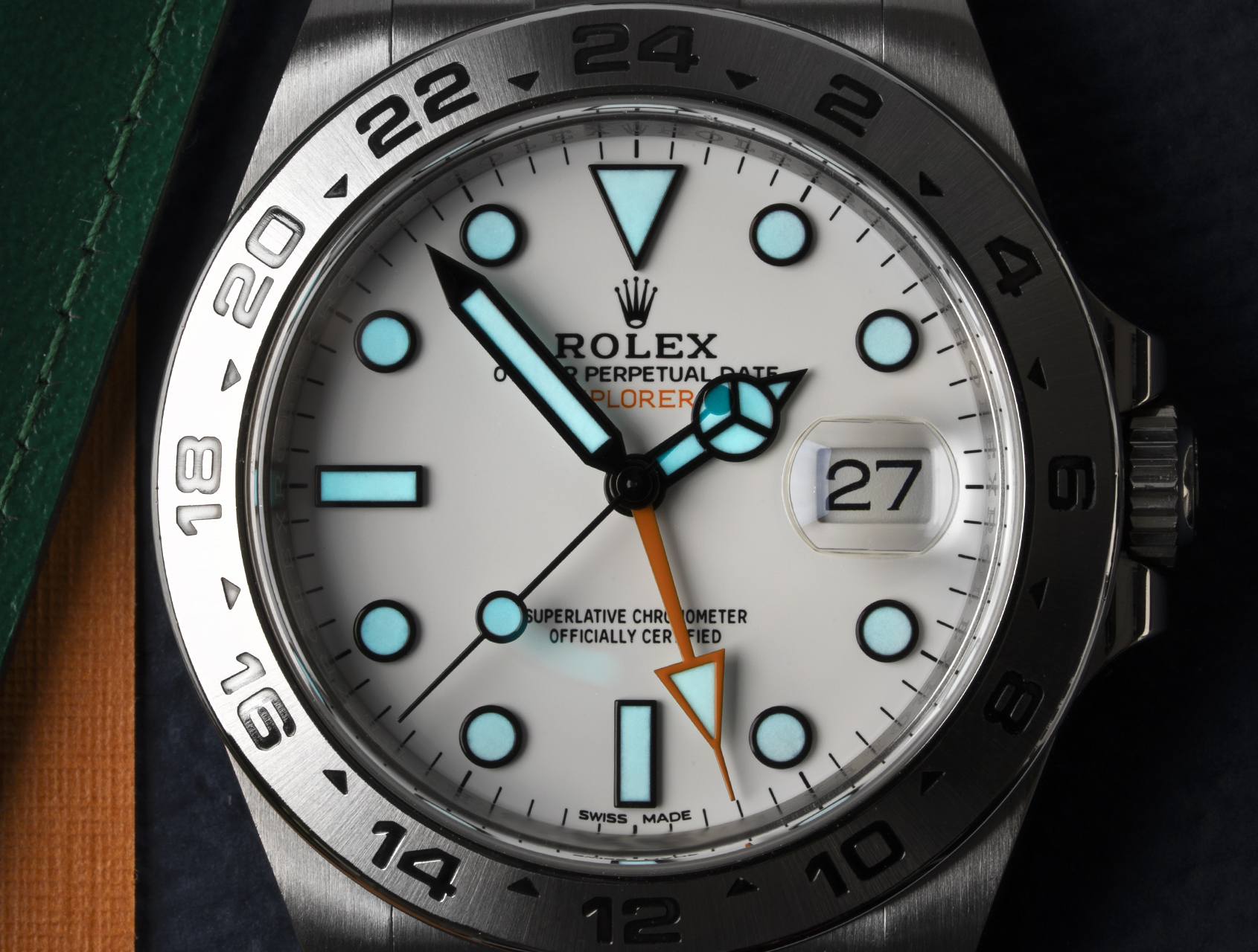 Originally released to celebrate 40 years of the ground breaking Explorer II, this 42mm orange-hand celebrates the advancements made in exploration. Its fixed steel bezel with 24-hr denotations, allows the wearer to independently track a full 24-hr cycle or run two time-zones simultaneously. As you can see from our photo, the superb bright blue-glowing Chromalight dial adds perfect legibility in low light conditions, exactly as you'd expect from a rugged exploration tool watch.
