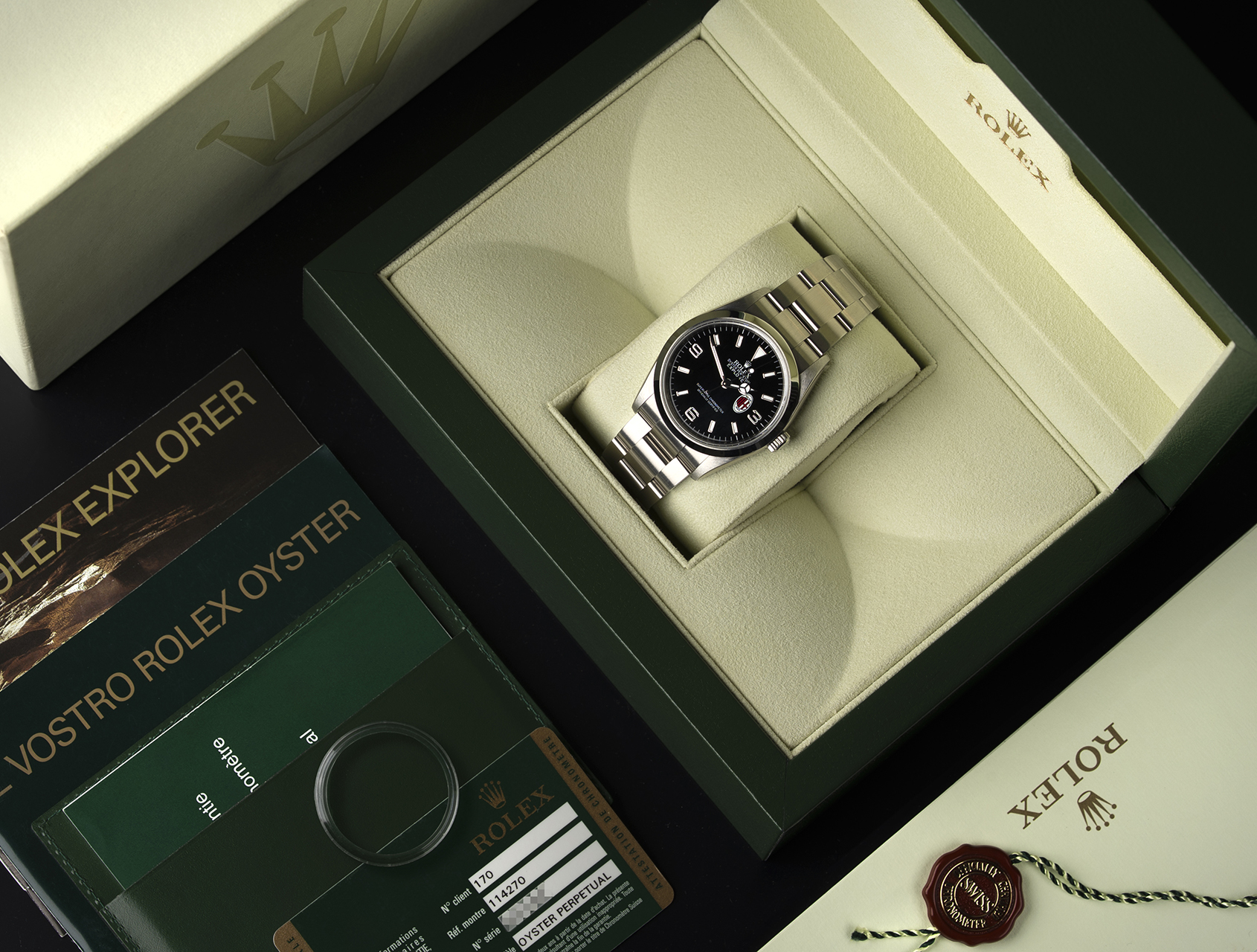 Totally brand new with all Rolex protective stickers intact and complete with its Rolex box (inner and outer), booklets, Explorer instructions, red swing tag, bezel protector, and Rolex international warranty card dated April 2008.