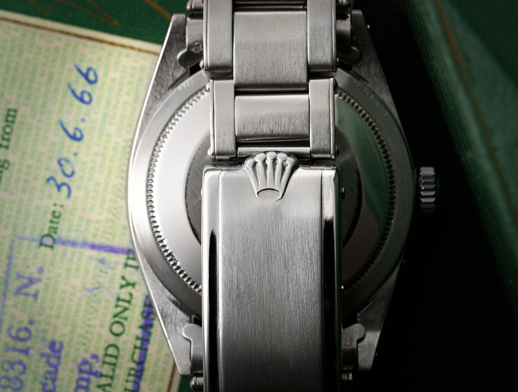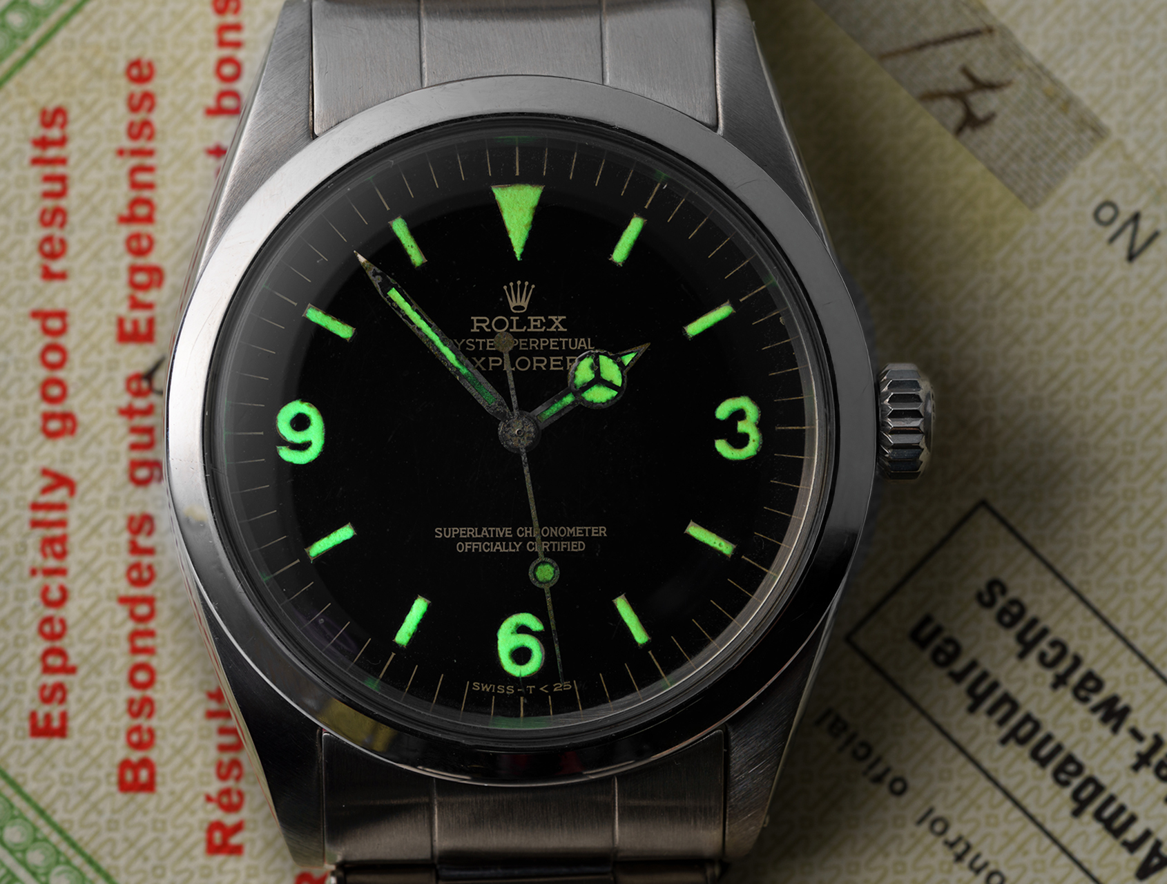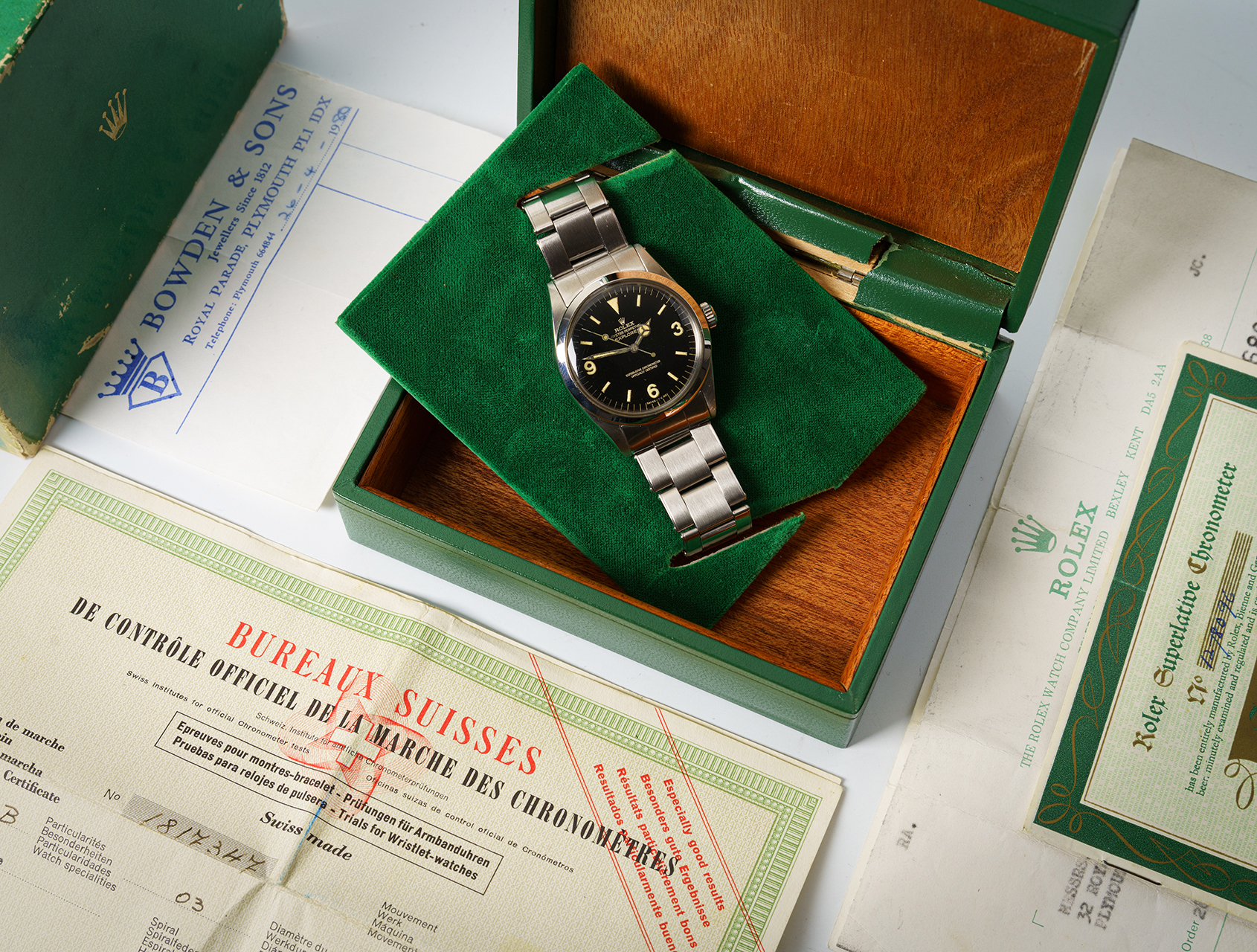A truly exceptional vintage Explorer ref. 1016 with gilt dial, retailed in June 1966. Complete with its green backed wooden Rolex box, rare Swiss Chronometer timing Certificate, and 1966 Superlative Chronometer guarantee. Further accompanied by its official Rolex service history.