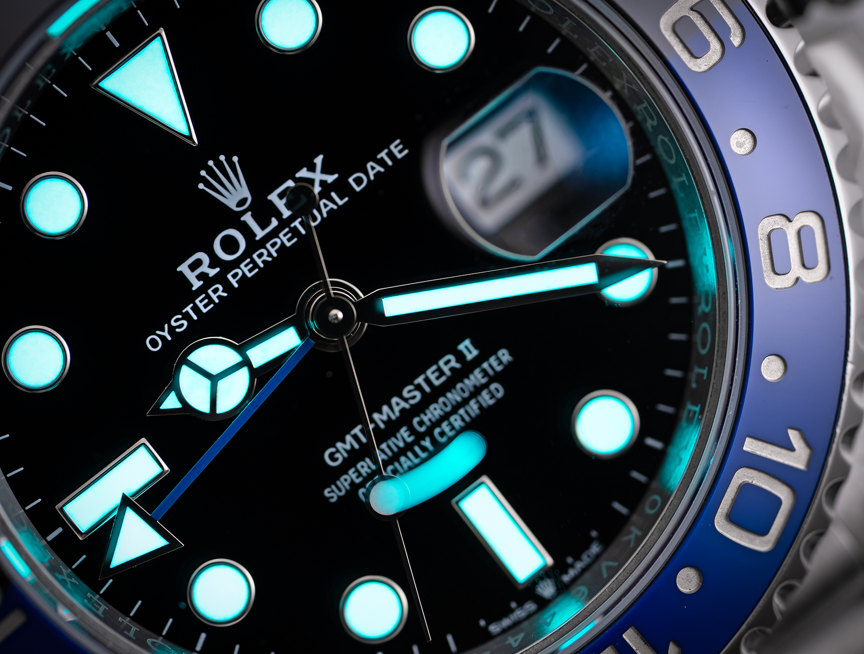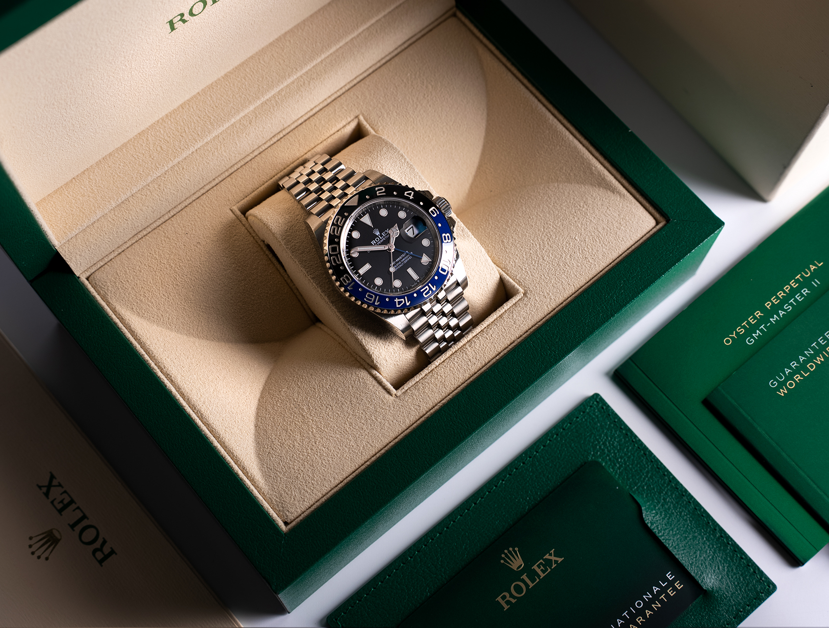 Under official Rolex warranty until April 2027, and complete with its Rolex box and international warranty card, this is the GMT-Master II Batgirl ref. 126710BLNR.