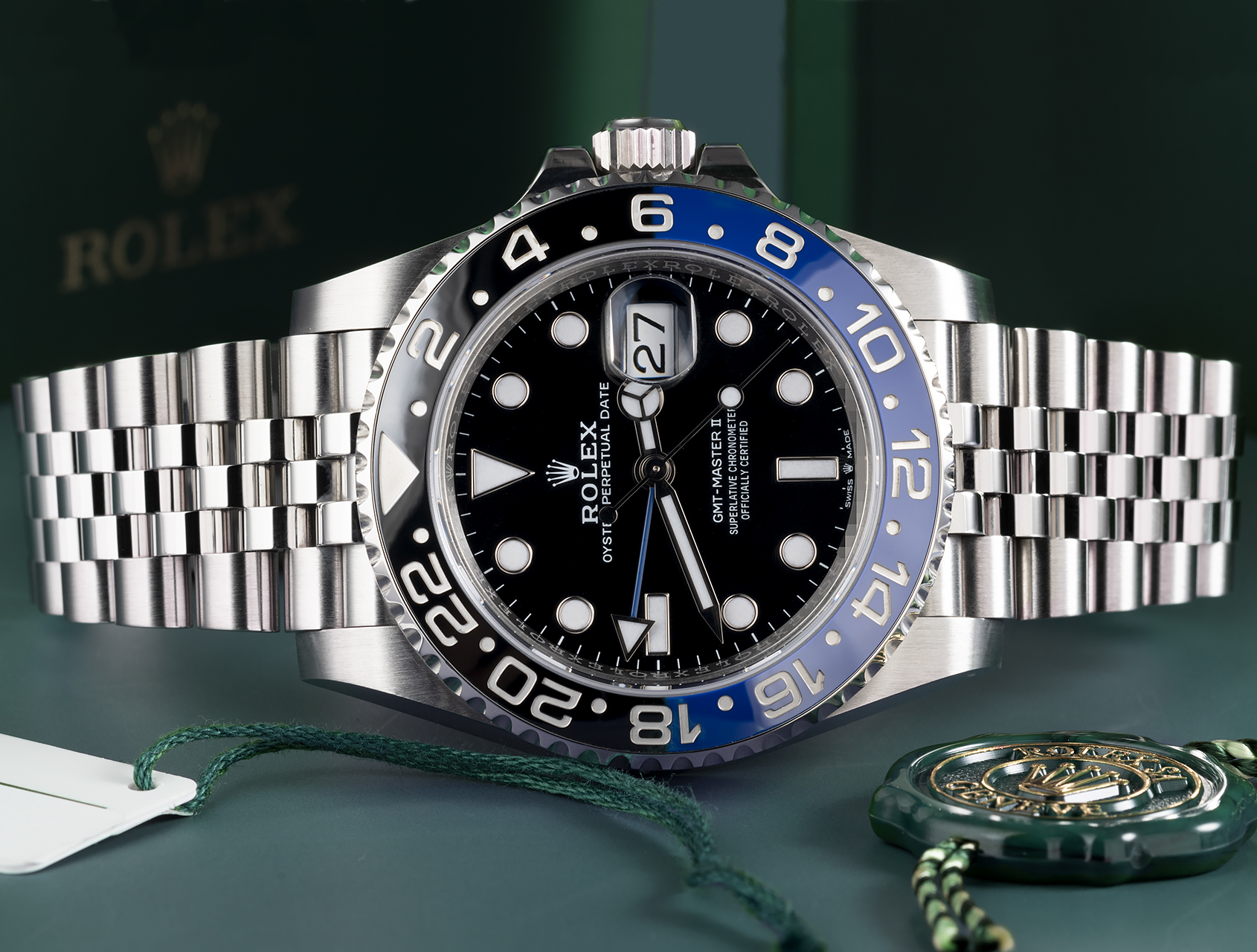 Originally retailed at Harrods, this dual-time GMT-Master II Batgirl ref. 126710BLNR is a perfect example; under Rolex international warranty until May 2026, and presented with its Rolex box, booklets, bill of sale, both swing tags, GMT-II instructions & Rolex international warranty dated May 2021.