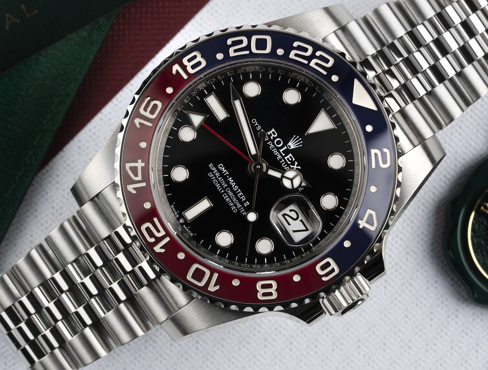 Completely brand new from Nov 2025, and without a doubt the most difficult GMT to find, this is the 'Pepsi' on Jubilee bracelet.