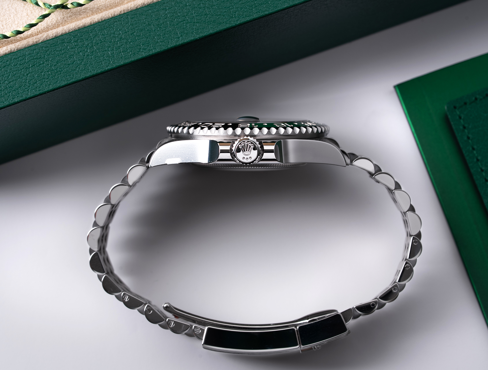 40mm 904L stainless steel case with green/black Cerachrom bezel, and green 24hr GMT hand for that second time-zone indication. Rolex self-winding dual-time calibre 3285 with 70 hour power reserve, 5mm Easylink for summer/winter adjustment, and waterproof to 100m.
