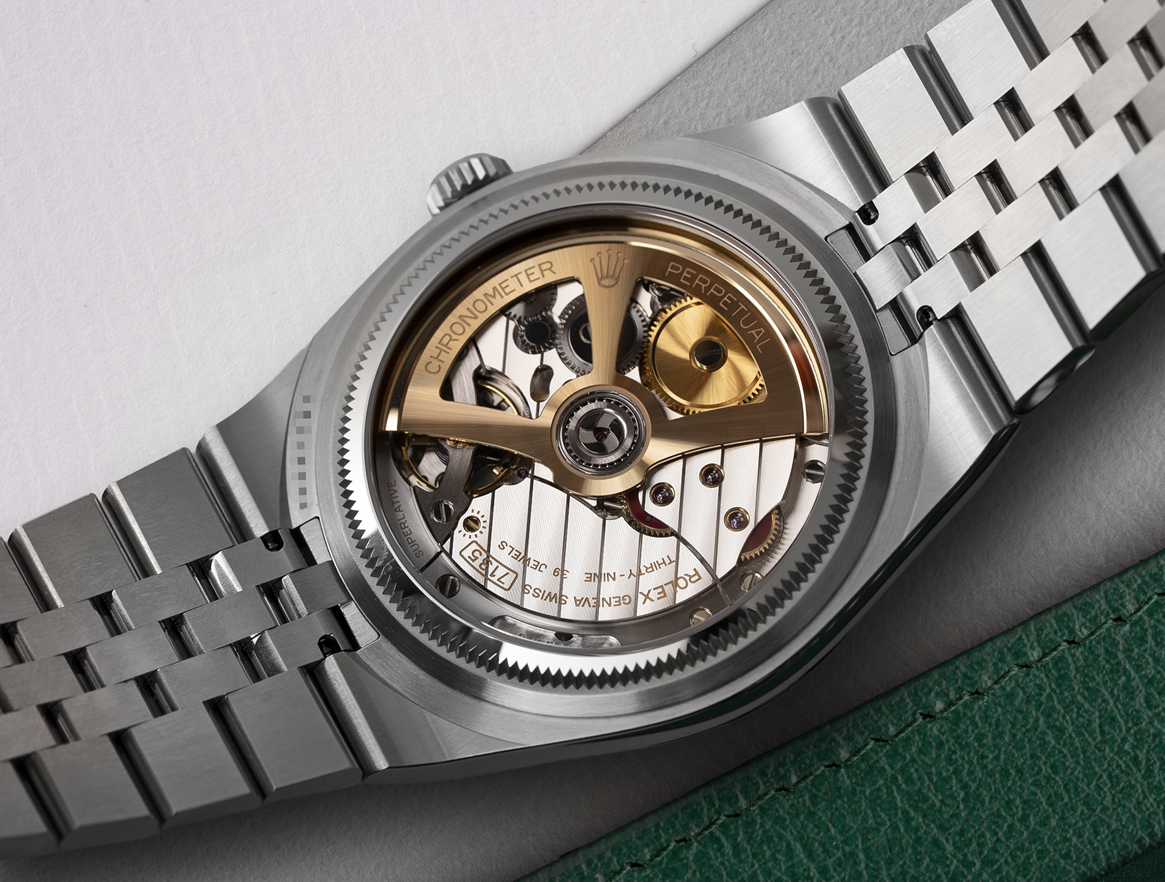 A rarity for Rolex, the all-new calibre 7135 is visible through a sapphire crystal case back. This movement beats at a high 5Hz frequency while still offering 66 hours of power reserve. The new Dynapulse escapement (a silicon-based dual-wheel system) drastically reduces friction and boosts efficiency, resulting in over a decade between servicing.