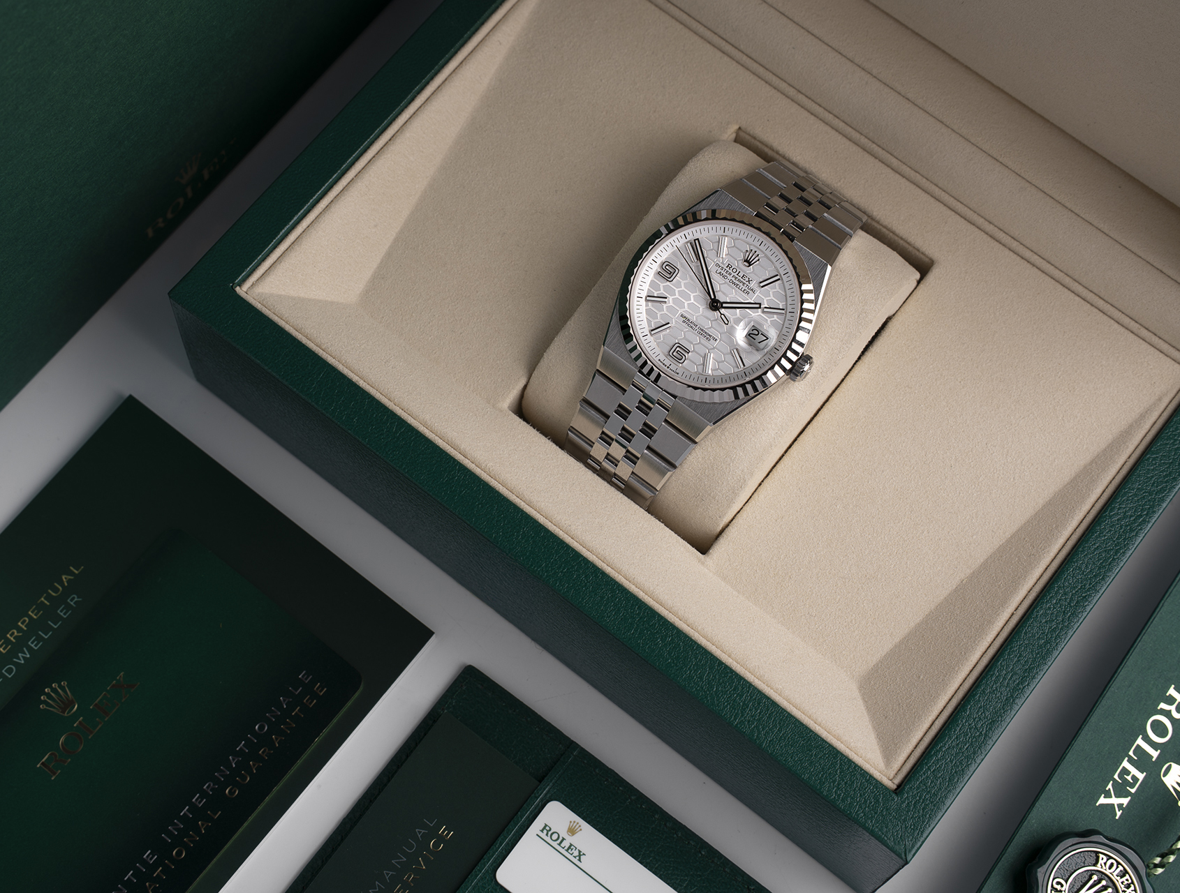 Crafted in stainless steel and 18ct white gold, its angular silhouette nods to Rolex’s rare 1970s Oysterquartz and is reminiscent of Genta's Royal Oak and Nautilus. The integrated industrial design of the flat Jubilee bracelet flows seamlessly into the fluted white gold bezel, merging case and bracelet into one continuous form.