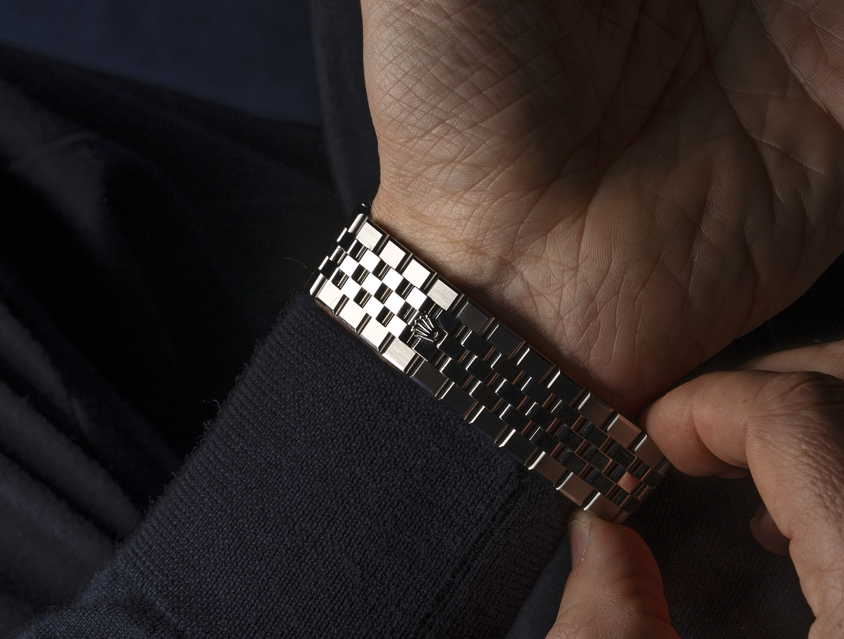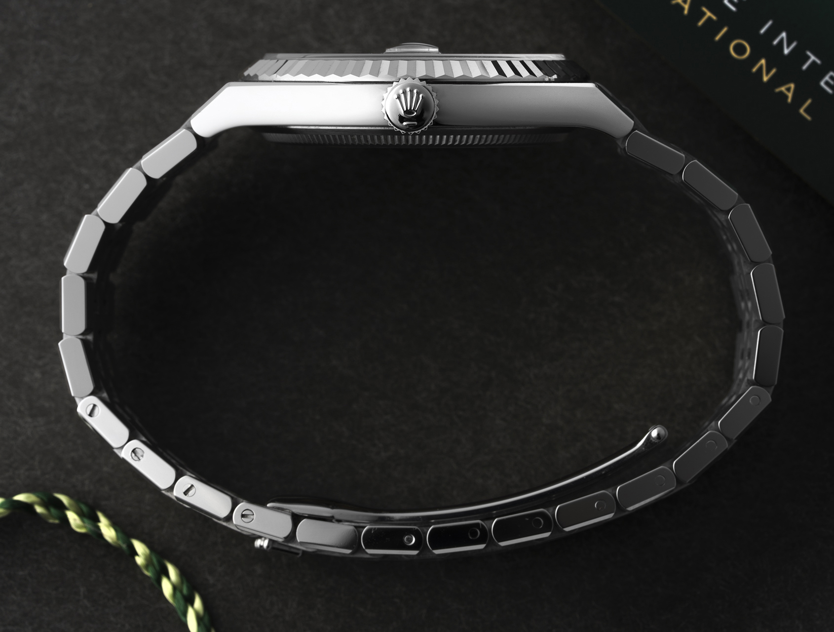 Crafted from stainless steel and 18ct white gold, its sharp, architectural lines subtly echo the rare 1970s Rolex Oysterquartz, while drawing comparisons to the integrated sports watch aesthetic pioneered by Gérald Genta. The flat Jubilee bracelet flows seamlessly into the case and fluted white gold bezel, creating a cohesive, industrial silhouette where case and bracelet become one continuous form.