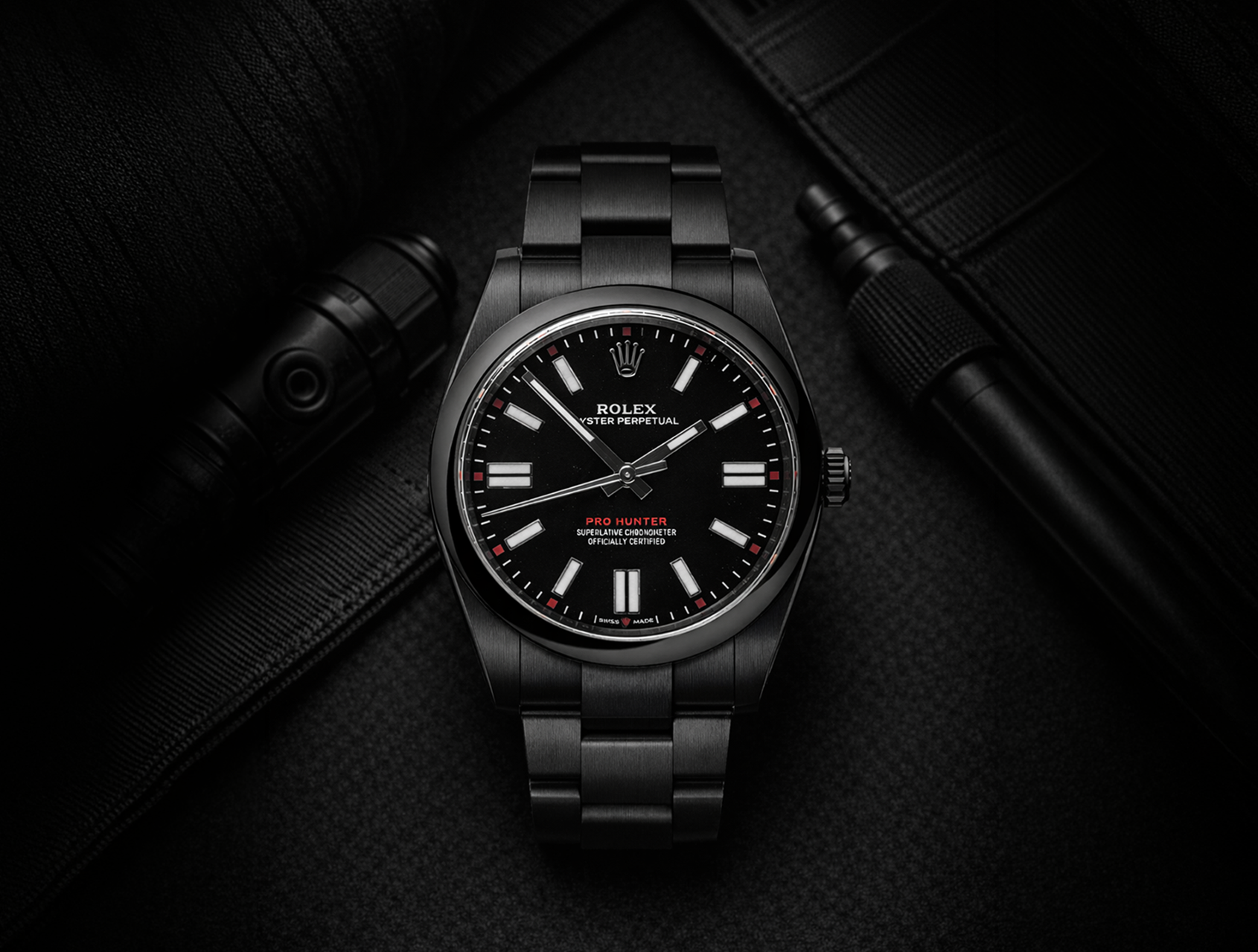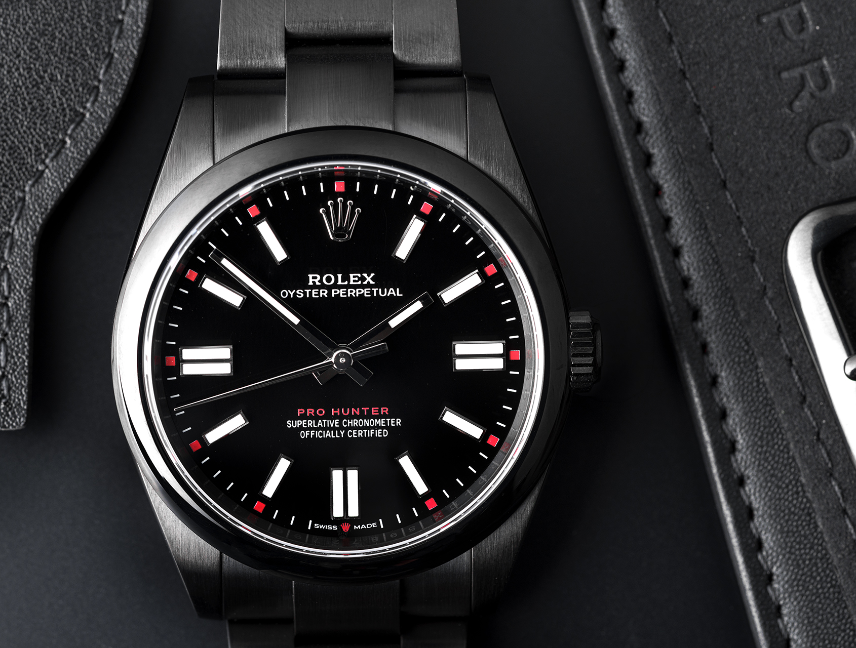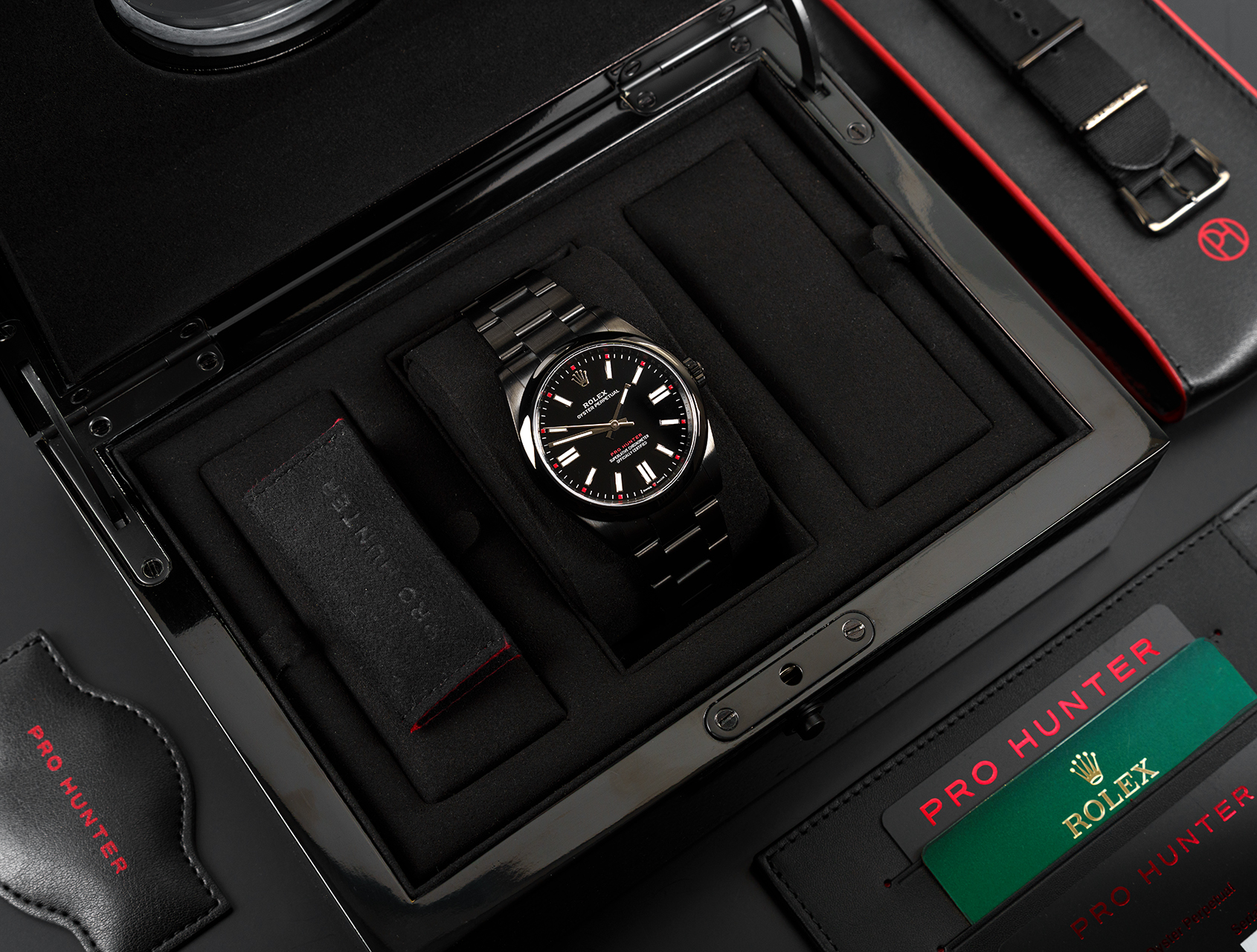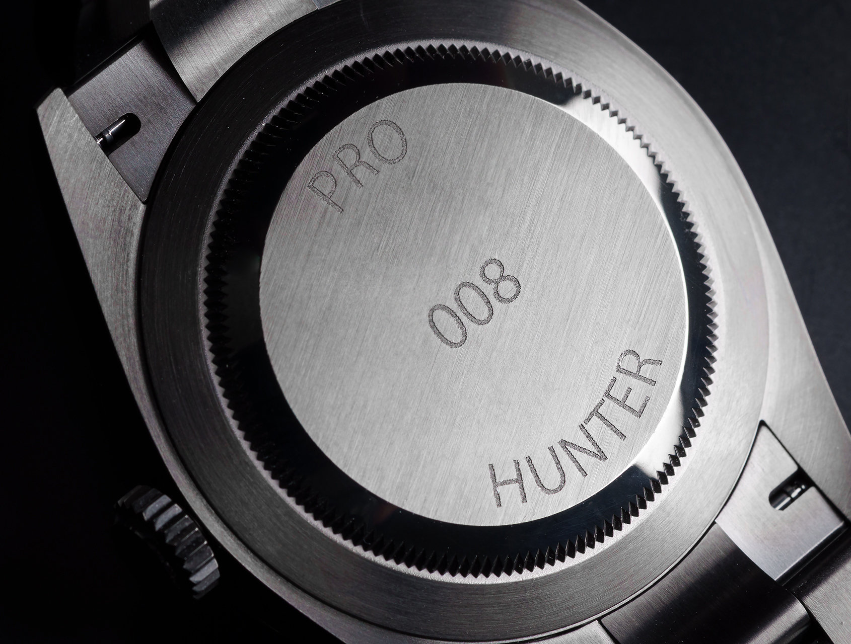 Treated with their robust signature black diamond like carbon (DLC) coating, fluo-red Pro Hunter moniker on the black sunray finished dial, and red-tipped hour markers.