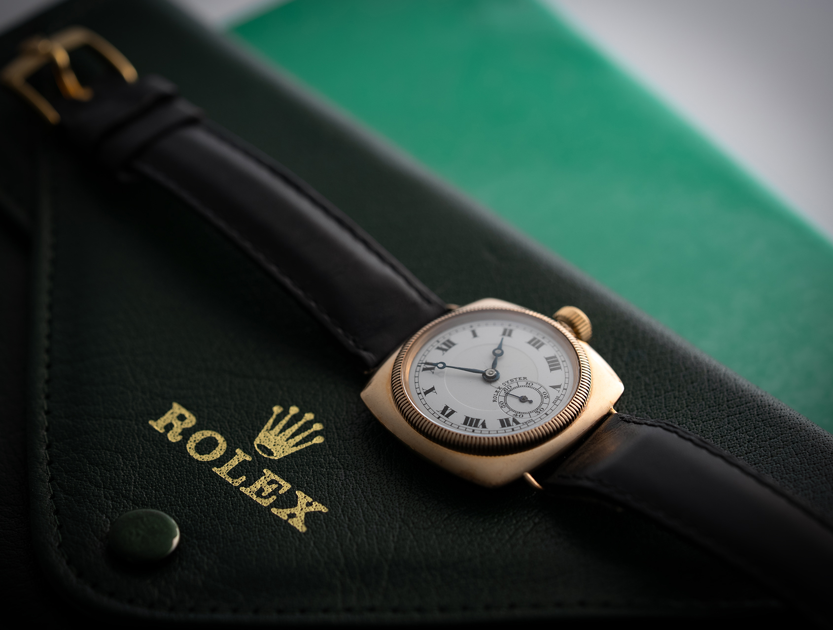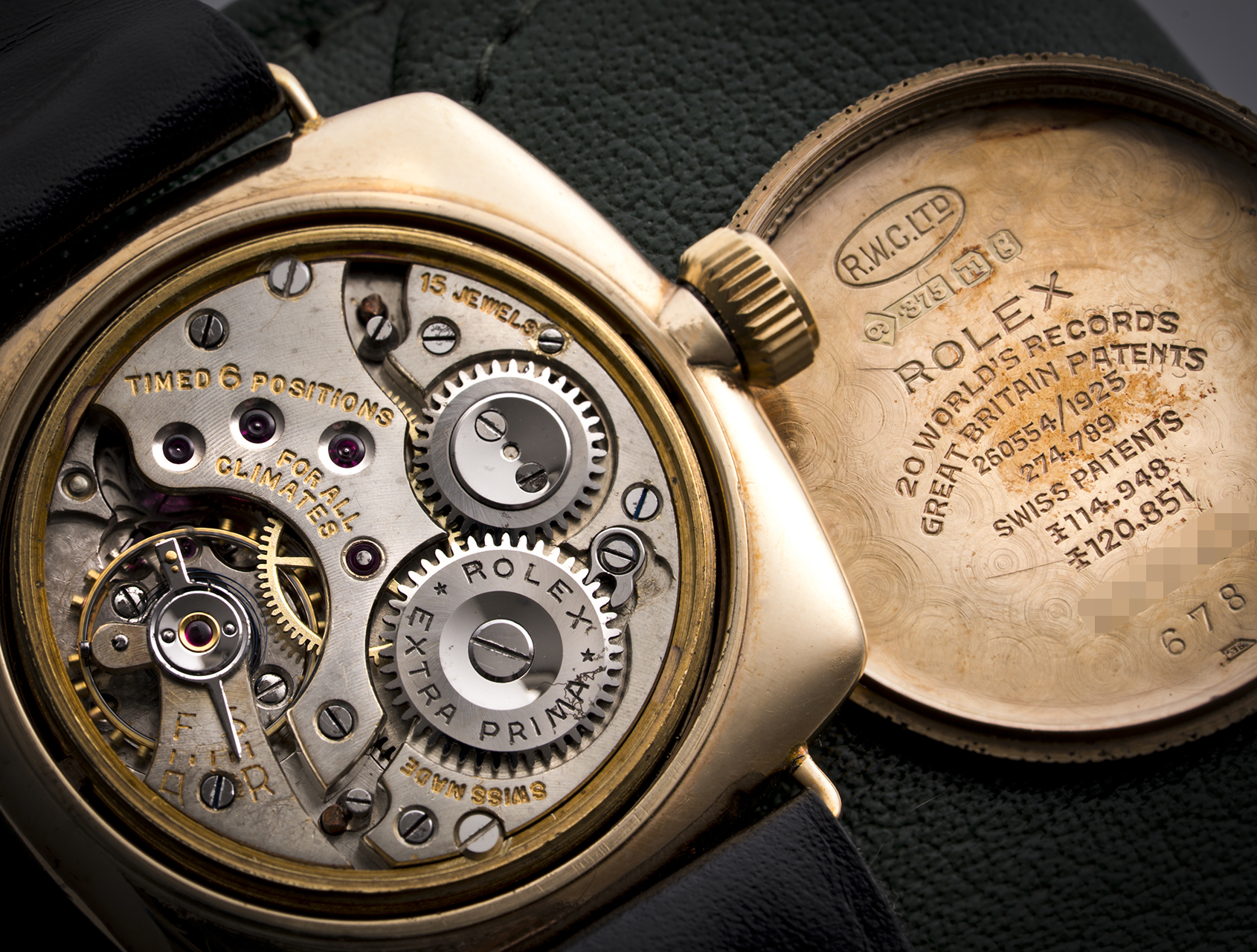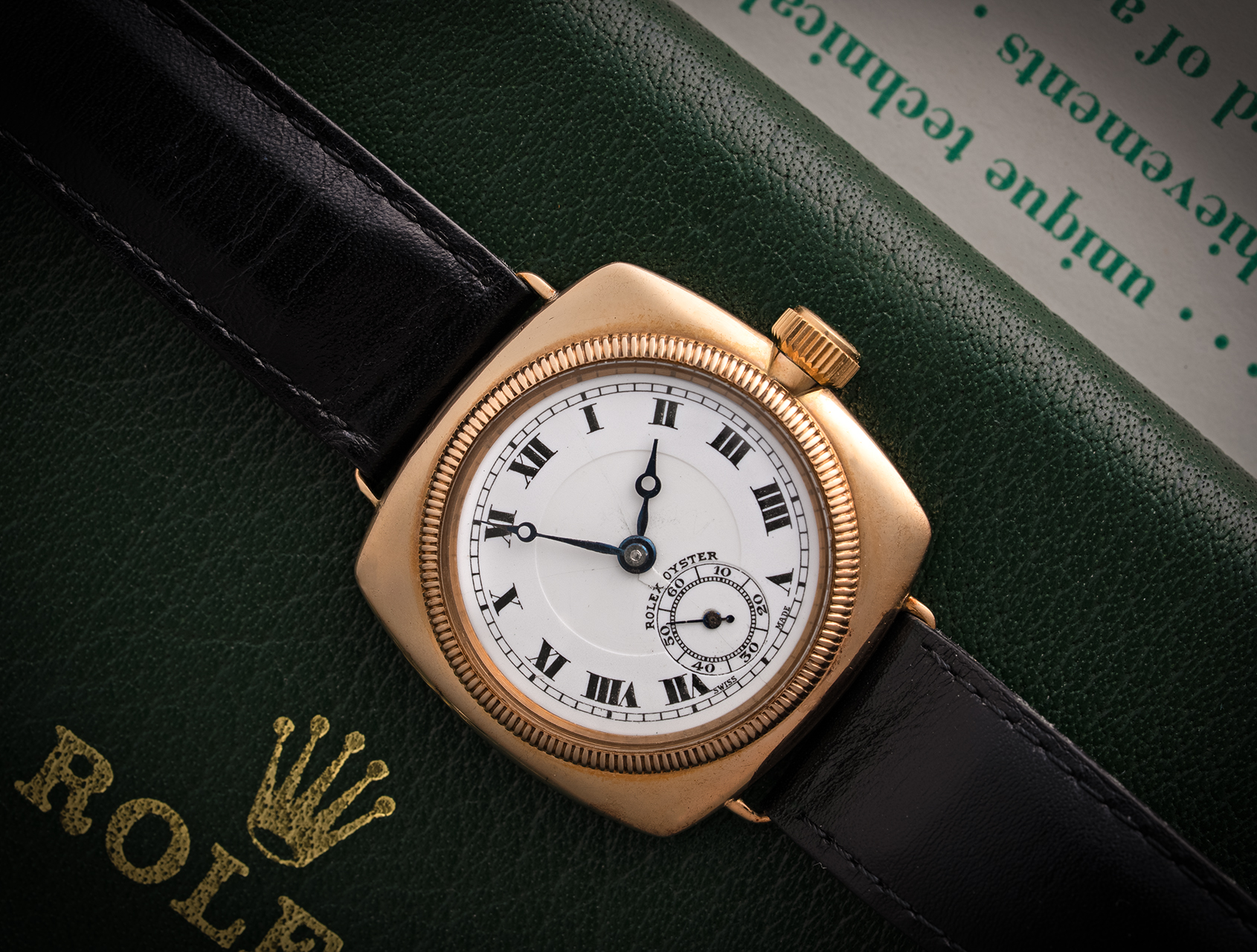This solid yellow gold Rolex Cushion Shape from 1930 is the foundation upon which every other Oyster stands, claiming 20 World Patens. An art-deco cushion case in superb condition, with clear and present assay marks inside the caseback, indicating this was hallmarked in Glasgow – 1929-1930.