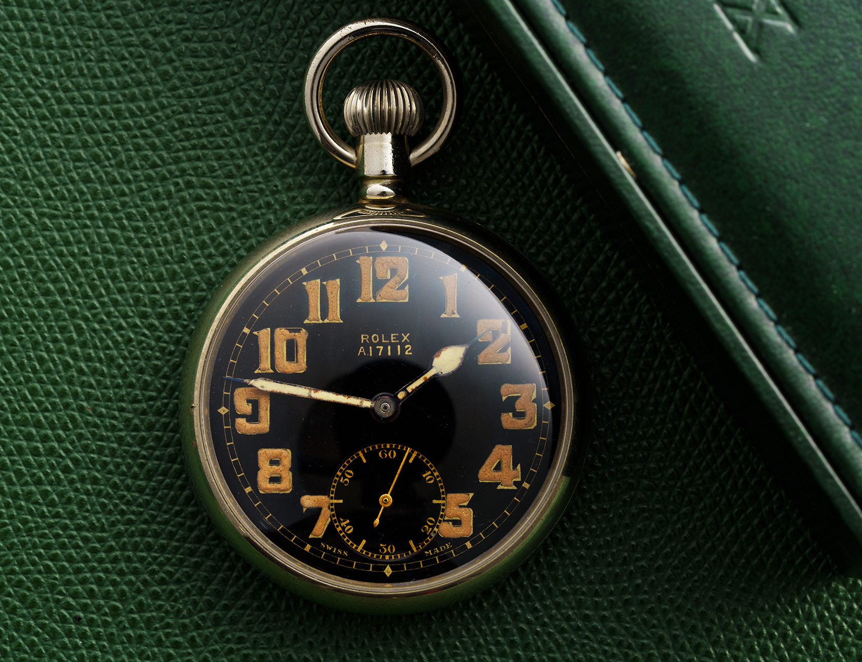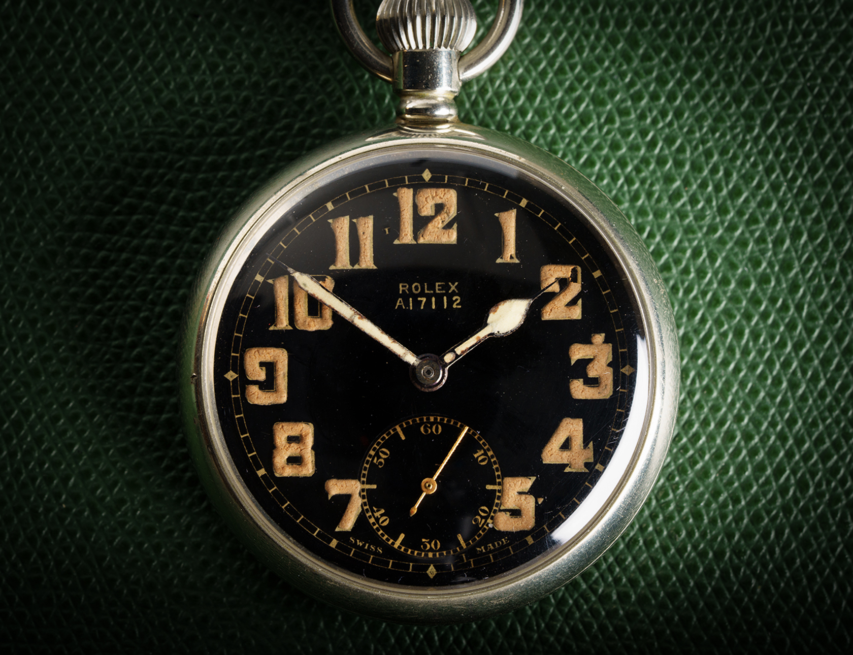 Rolex certainly fulfilled the brief. Although not large as pocket watches go, the movement is exceptionally sturdy, and very precise, with top-quality thermo-compensated cut balance and blued Breguet balance spring. Housed in a nickel case with British Broad Arrow markings.