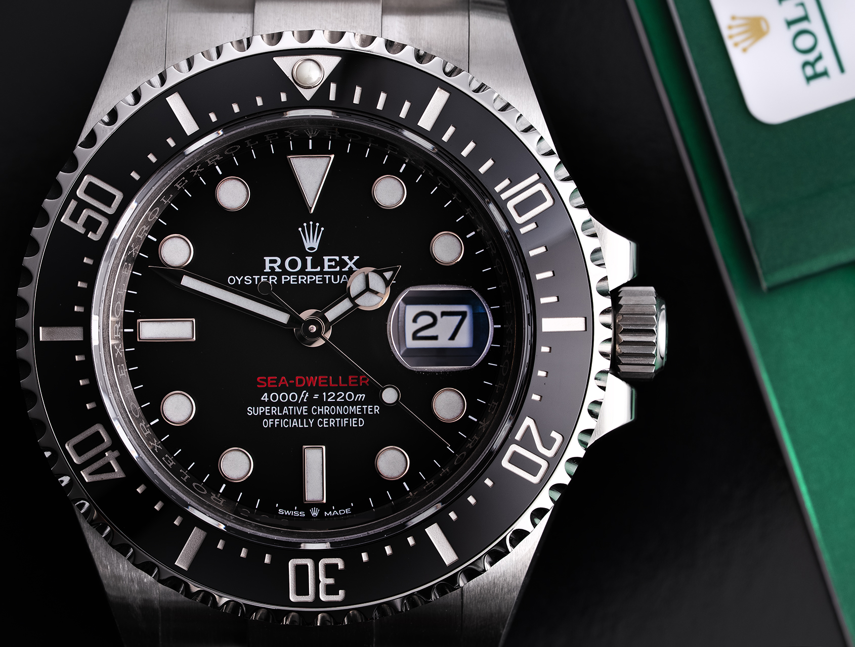 This latest 43mm Sea-Dweller 'red writing' was UK retailed in March 2019 and is presented complete with its Rolex box, booklets, Sea-Dweller instructions, both swing tags and Rolex international warranty card.