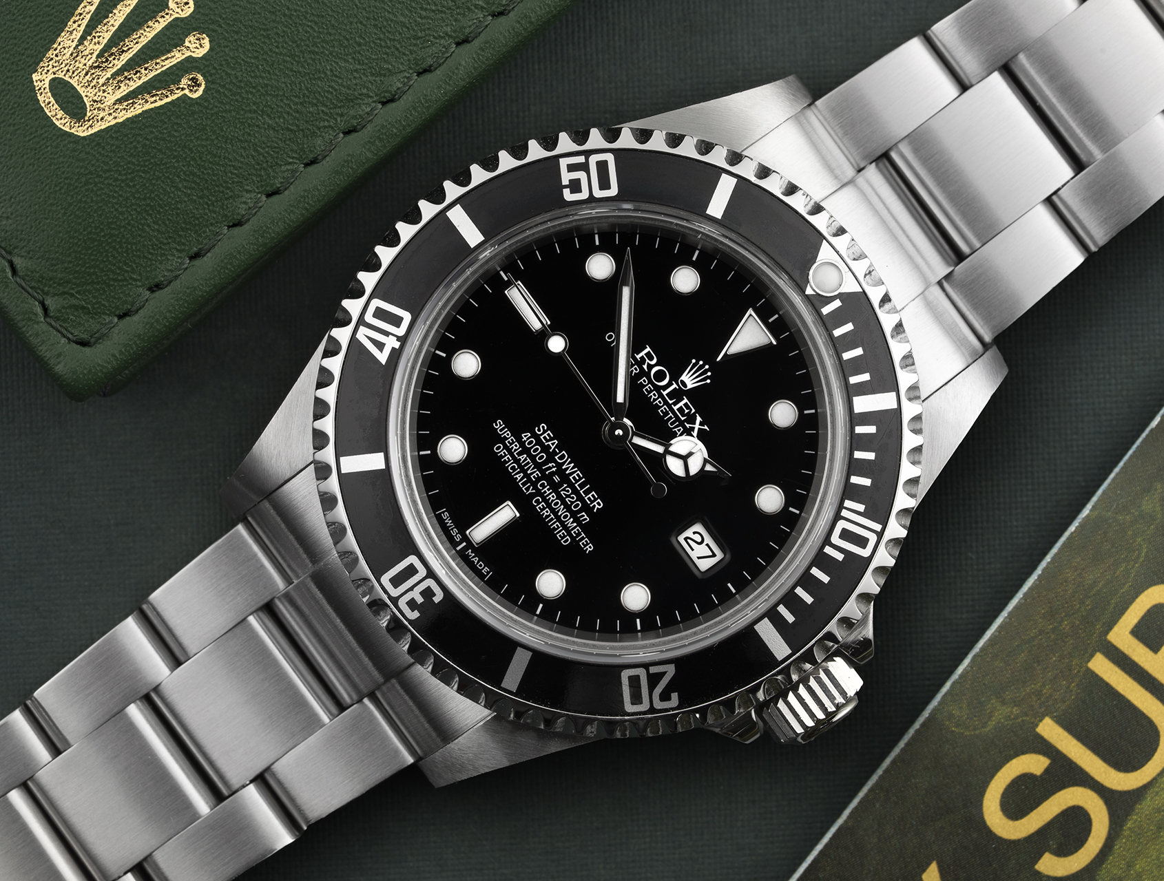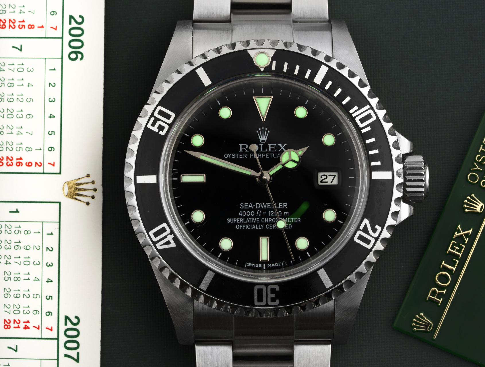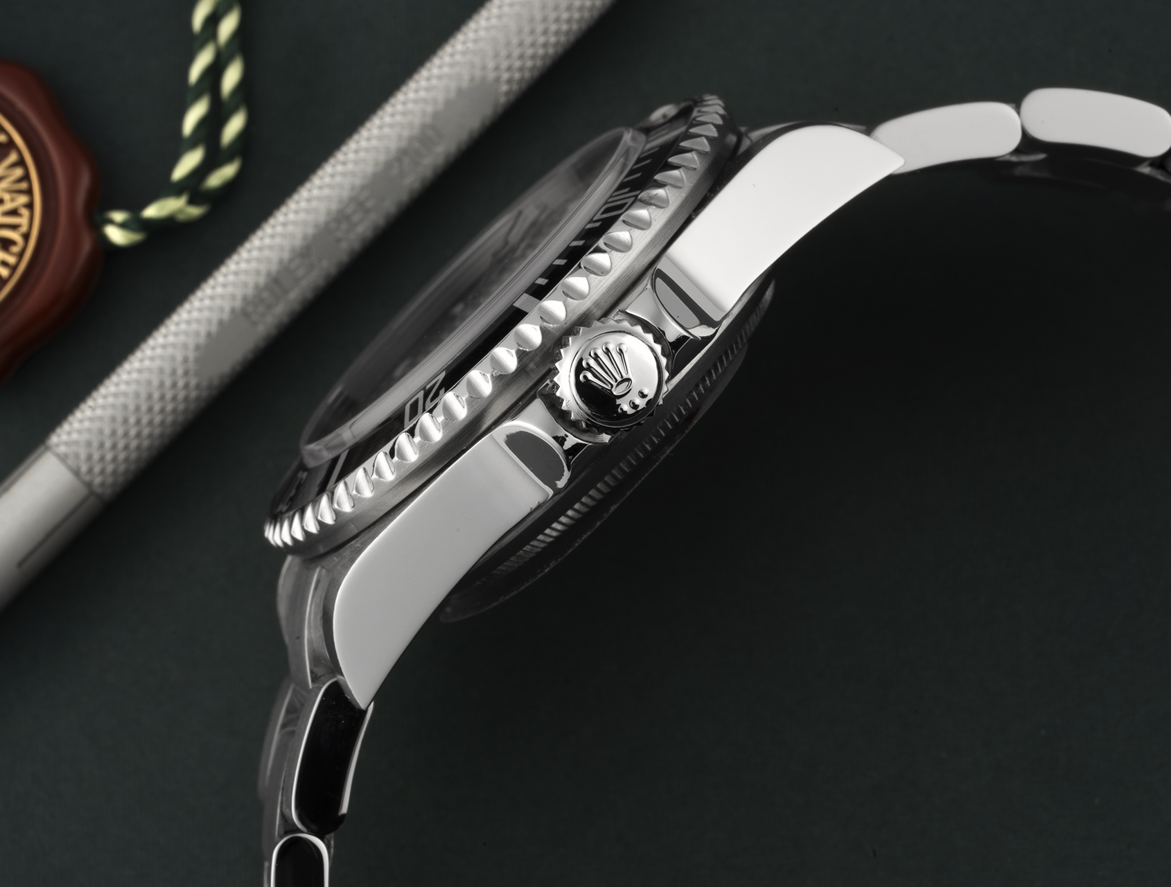 Designed to dive 4,000ft below water, the 40mm stainless steel case is a fraction thicker than the standard Submariner, but still wears well on the wrist. Its helium escape valve first designed for submersion diving is autonomous, unlike other divers models which have to be manually operated. Black glossy dial with bright green glowing Super-LumiNova provides excellent legibility in low light conditions, fitted to its robust Oyster Fliplock bracelet, with solid end links (SEL) and powered by Rolex's self-winding calibre 3135.