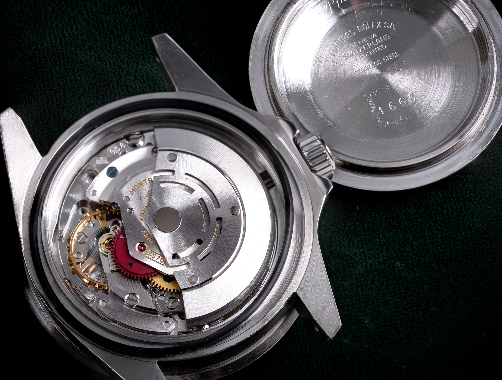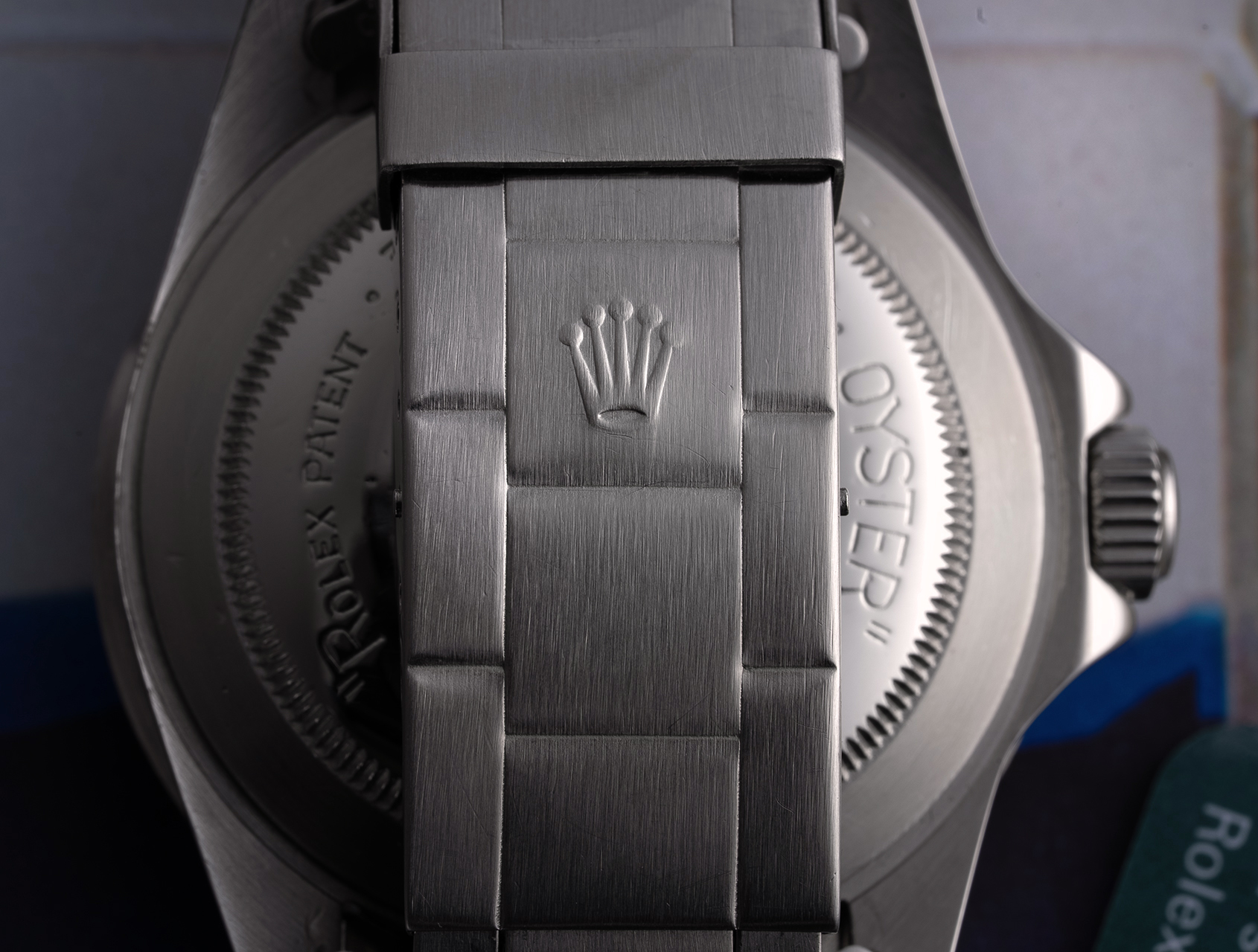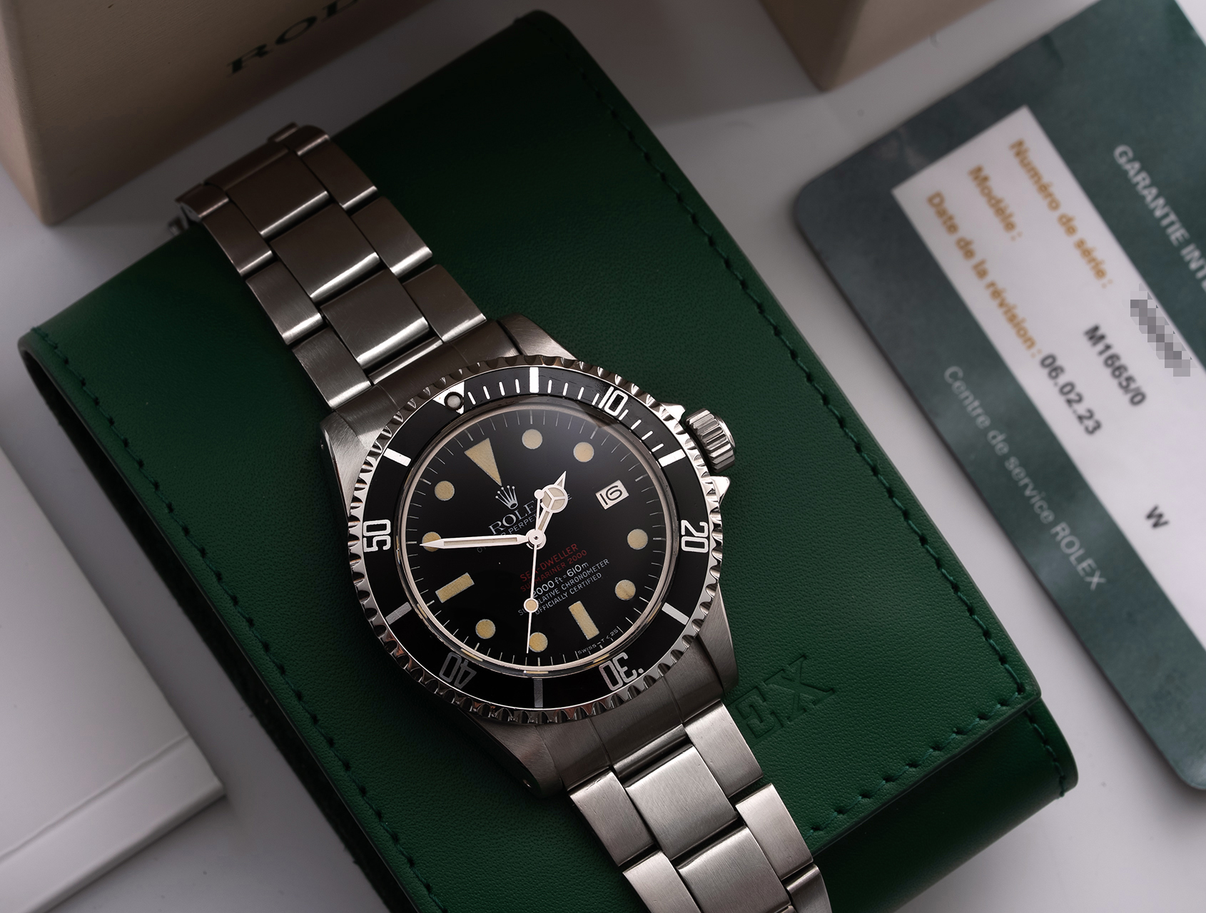 It was refreshing to acquire such a well-preserved Double Red Sea-Dweller, directly from the family of the original owner; handed down from father to son. Purchased in 1974 and worn sparingly, this rare Plexiglas Double Red ref. 1665, shows numerous Rolex service etchings inside the caseback, but (importantly for vintage) with almost no restoration. Its most recent documented service with Rolex was February 2023.