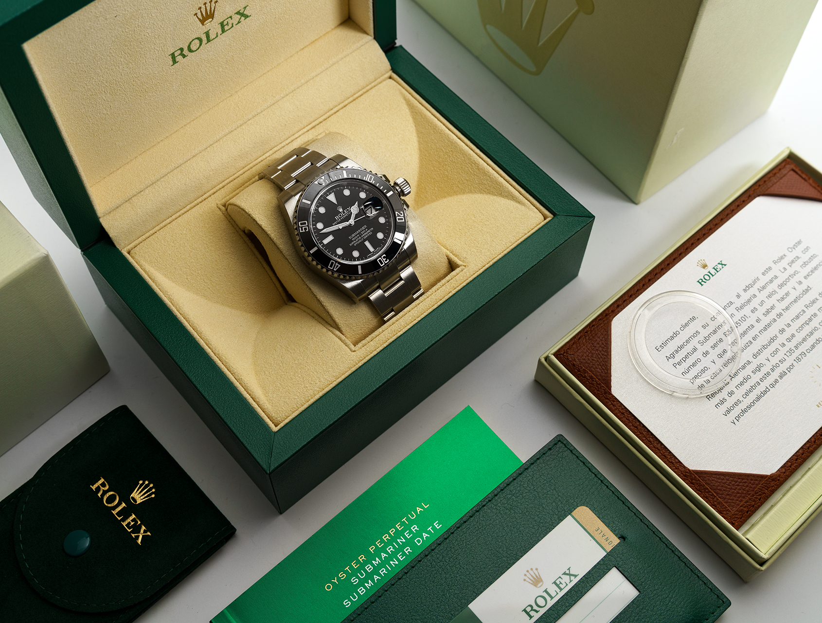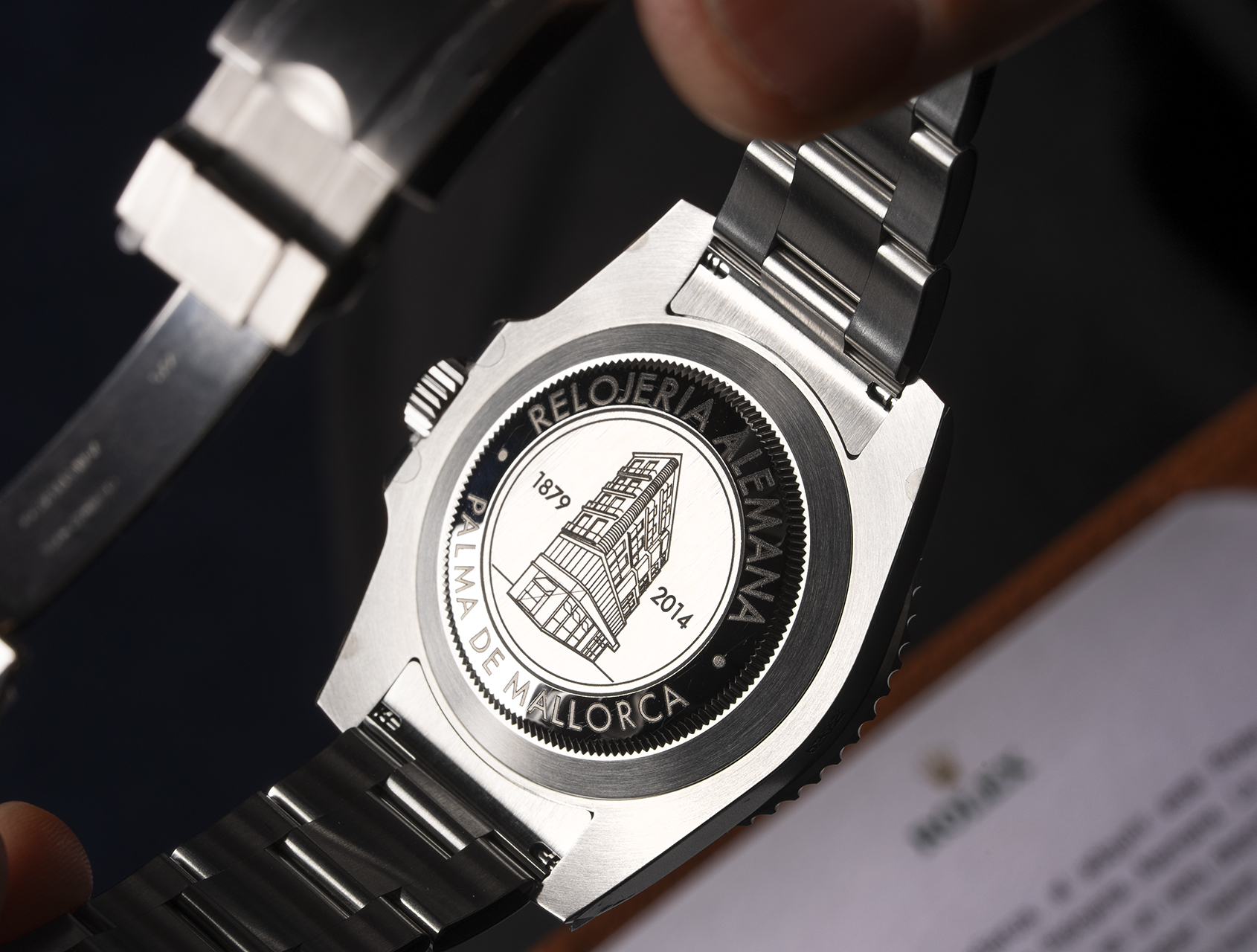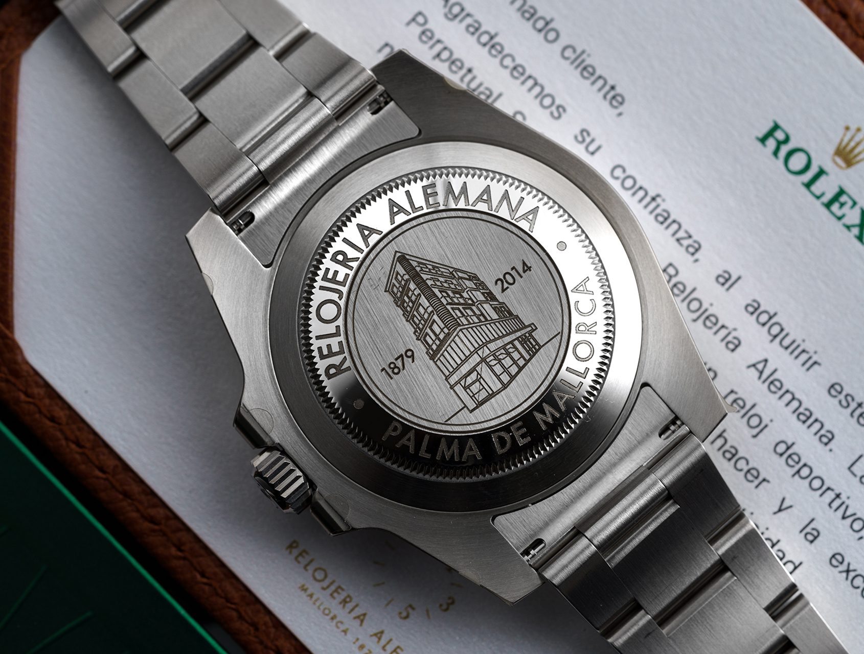 This Ceramic bezel Submariner Date 116610LN was created in 2014 exclusively for Relojería Alemana in Mallorca to mark their 135th anniversary. Production was limited to just 135 pieces. The case back is specially engraved with their historic building, and the watch is accompanied with its Rolex warranty card and special Rolex letter confirming this rare production.