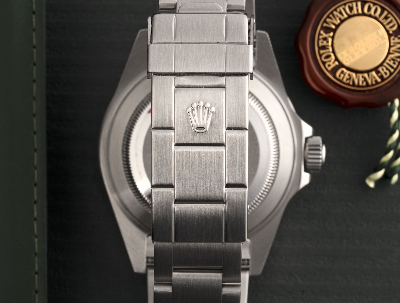 Powered by Rolex's self-winding calibre 3135, waterproof to 300m, and fitted to the sporty Oyster fliplock bracelet. Presented with its Rolex box, booklets, red swing tag, bezel protector, calendar card, and Watches Of Switzerland perforated Certificate dated April 2006.
