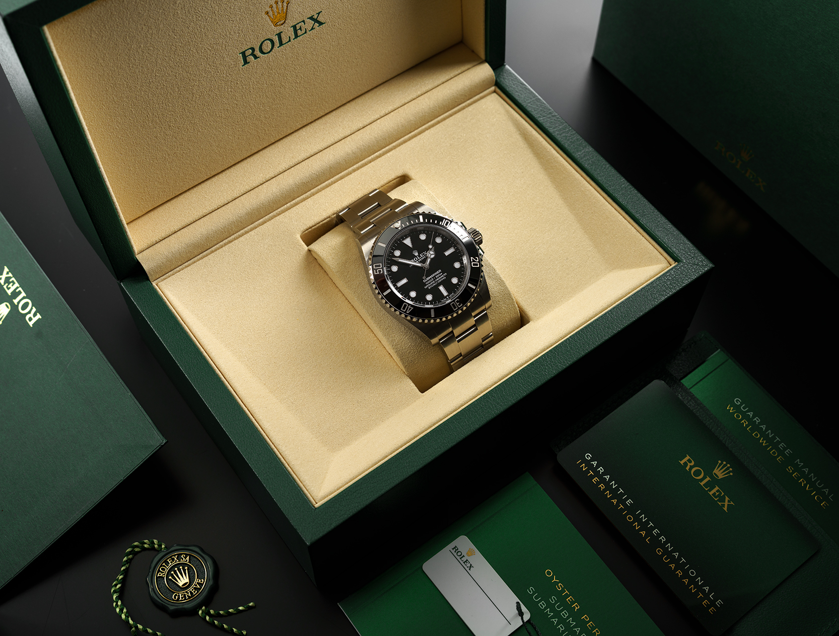 Accompanied totally complete with its Rolex box, booklet, Submariner instructions, both swing tags, and Rolex international warranty card.